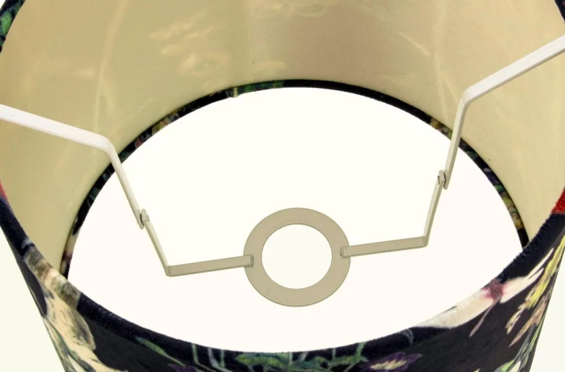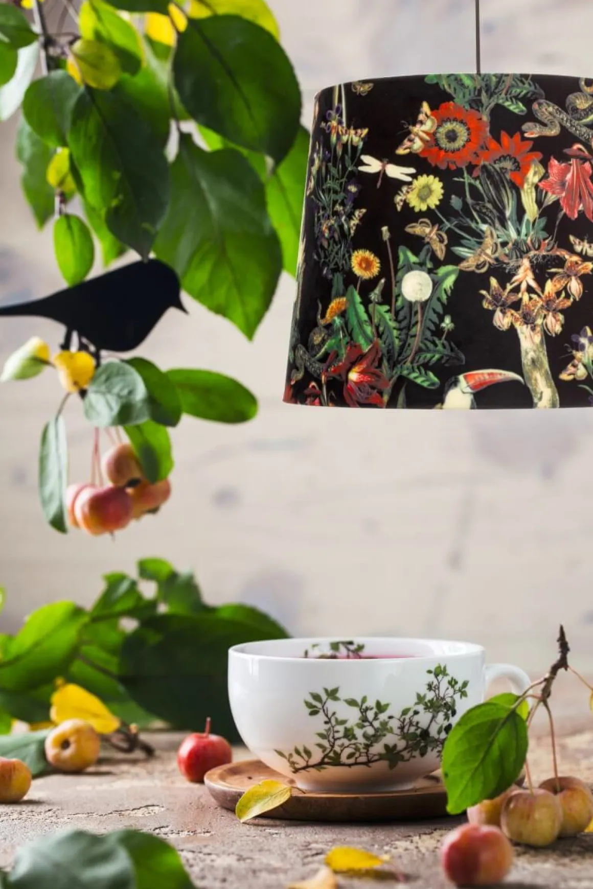 Härligt mönstrad skärm från Aneta med bas i svart sammet. 30 cm i diameter med ringfäste.