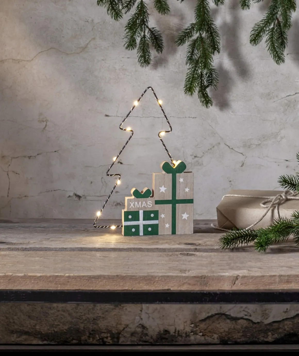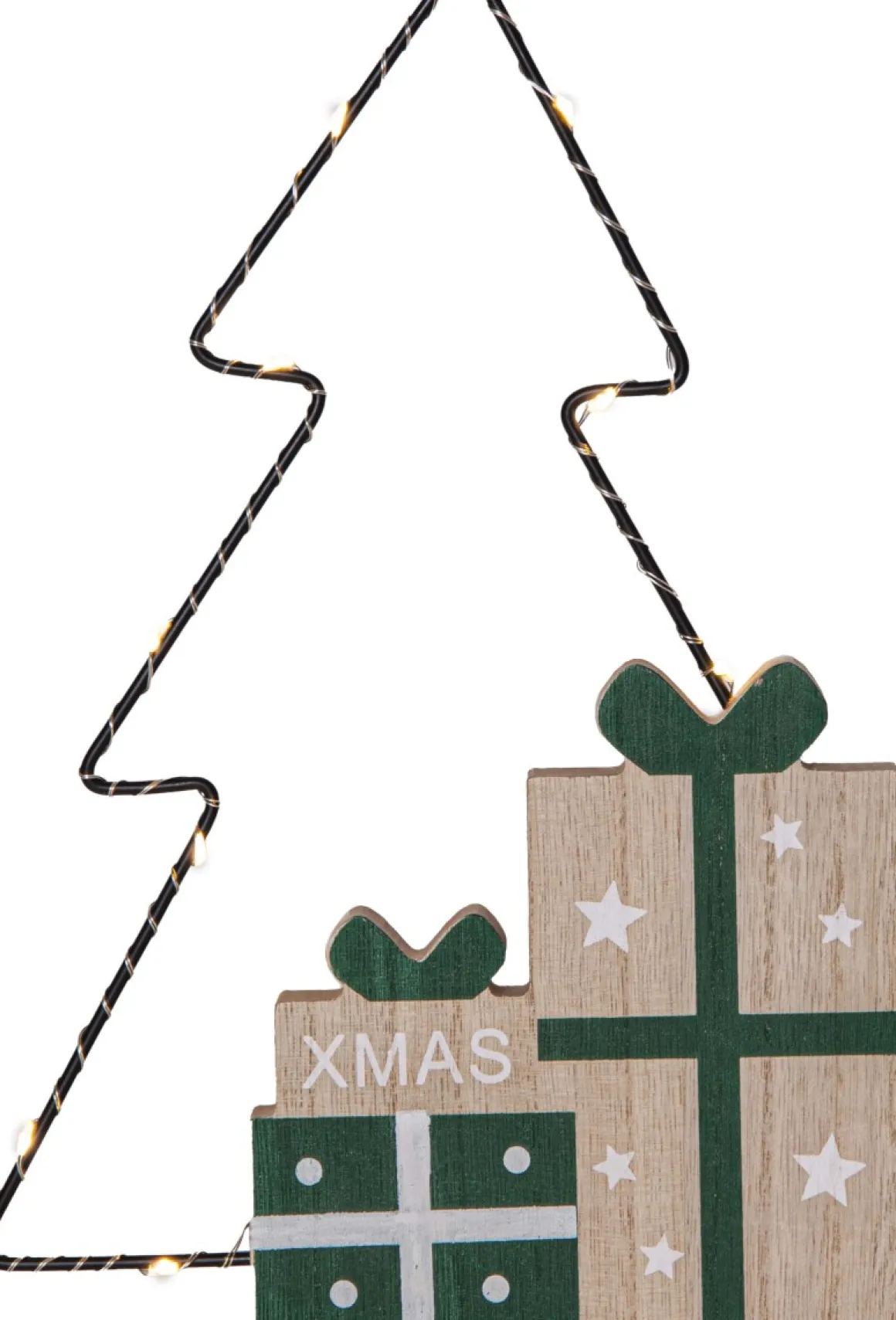Skapa julstämning med denna charmiga juldekoration! Siluetten i metall är formad som en julgran och pryds av fint målade träpaket. De små virade LED-lamporna lyser vackert genom granen och ger ett magiskt sken. Perfekt för att lysa upp en hylla eller ett fönster. Den drivs av batteri, vilket gör det enkelt att placera den var du vill utan att tänka på sladdar.