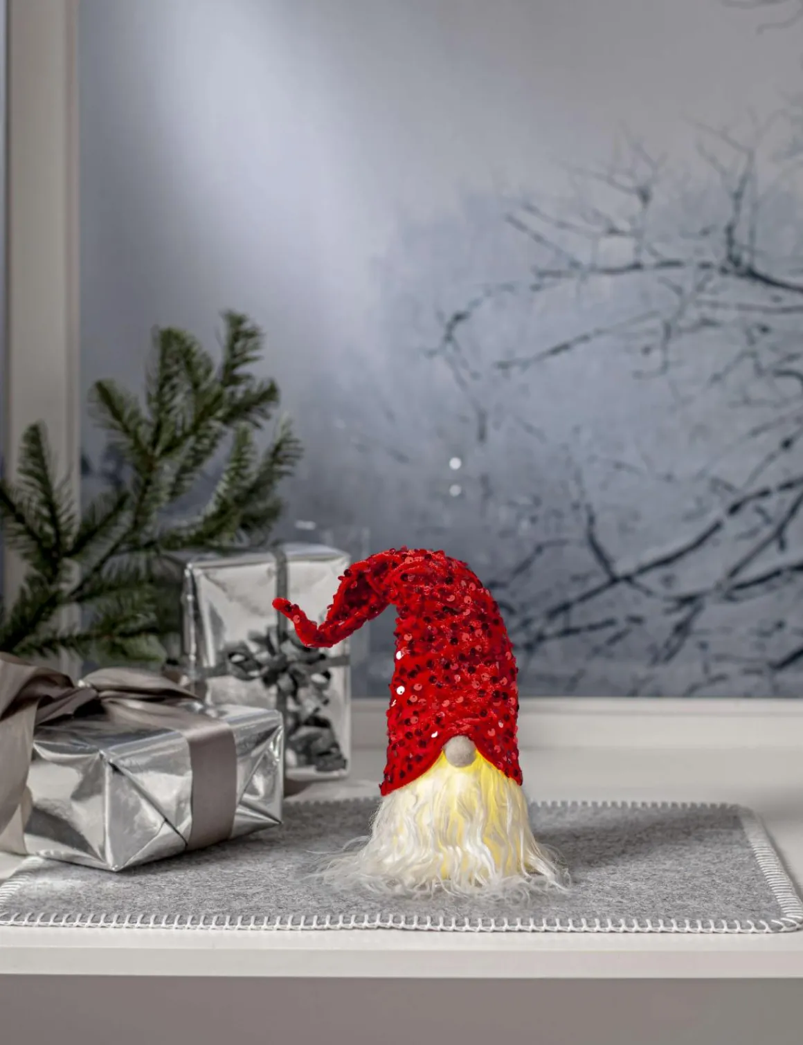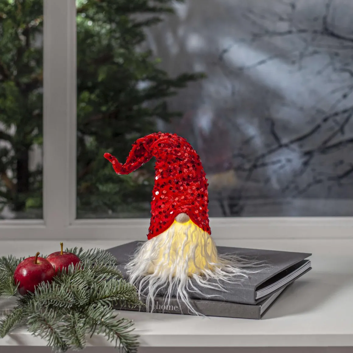 Meeen hur söt får man va? Super gullig liten batteridriven tomte med rödglittrig luva. Så enkel dekoration att pynta med i ditt hem och stuga för den där rätta julkänslan.