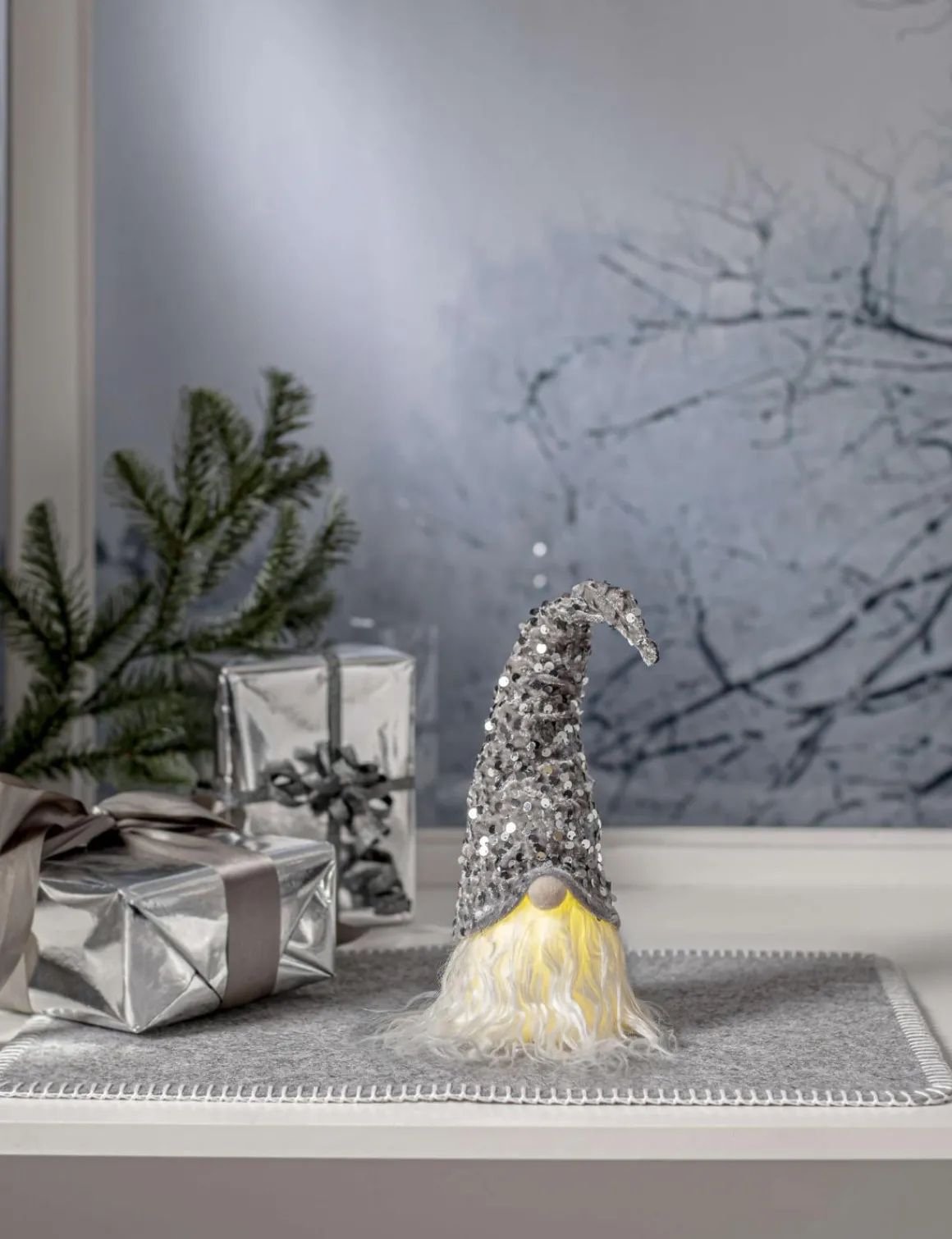 Meeen hur söt får man va? Super gullig liten batteridriven tomte med silverglittrig luva. Så enkel dekoration att pynta med i ditt hem och stuga för den där rätta julkänslan.