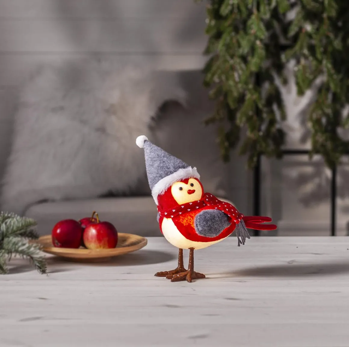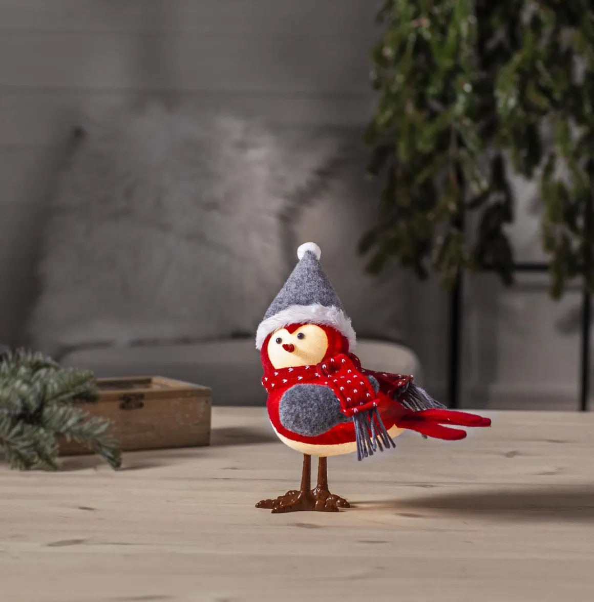 Så söt liten fågel iklädd julkläder med lysande kropp. Dekorera med till jul och advent. Batterier köpes separat.