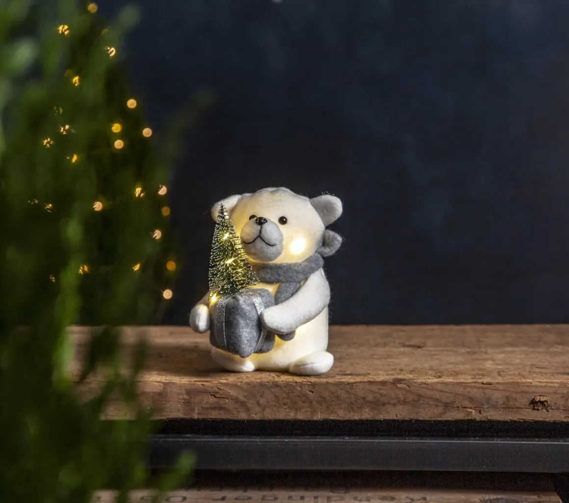 Så söt liten isbjörn med paket och gran i famnen, när dekorationen är igång så lyser det i kroppen och i granen. Dekorera med till jul och advent. Batterier köpes separat.