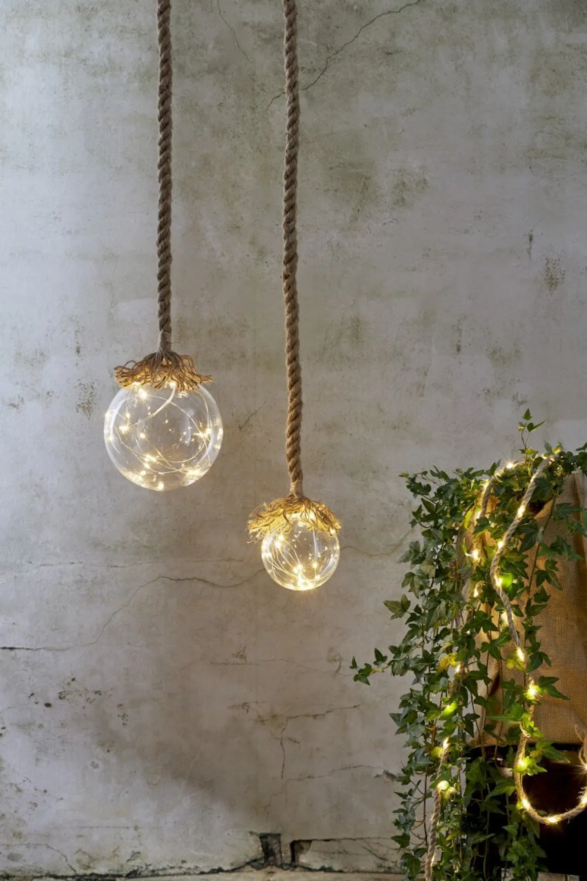 Cooool dekorationskula 15cm med den läckra dewdropslingan inuti, nu med läckert upphäng i vävt grovt juterep, drivs med batterier och har självklart en inbyggd timer