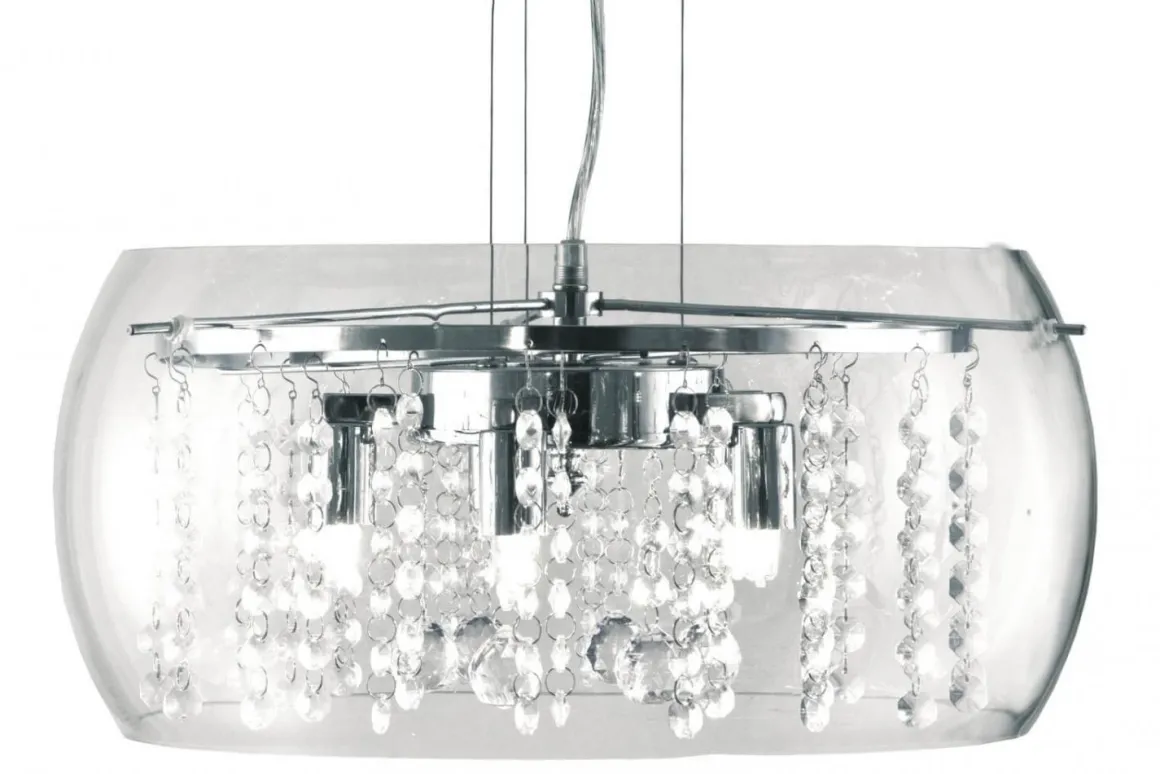 Ohlallaaa vilken läckerbit. Klara från Aneta har precis allt man kan önska av en kristallkrona….förutom just kristall då möjligtvis. Stomme i blank krom omgiven av svagt välvt glas med massor av glittrande akrylprismor i mitten. Självklart har hon även krokupphäng för en snabb och smidig installation.