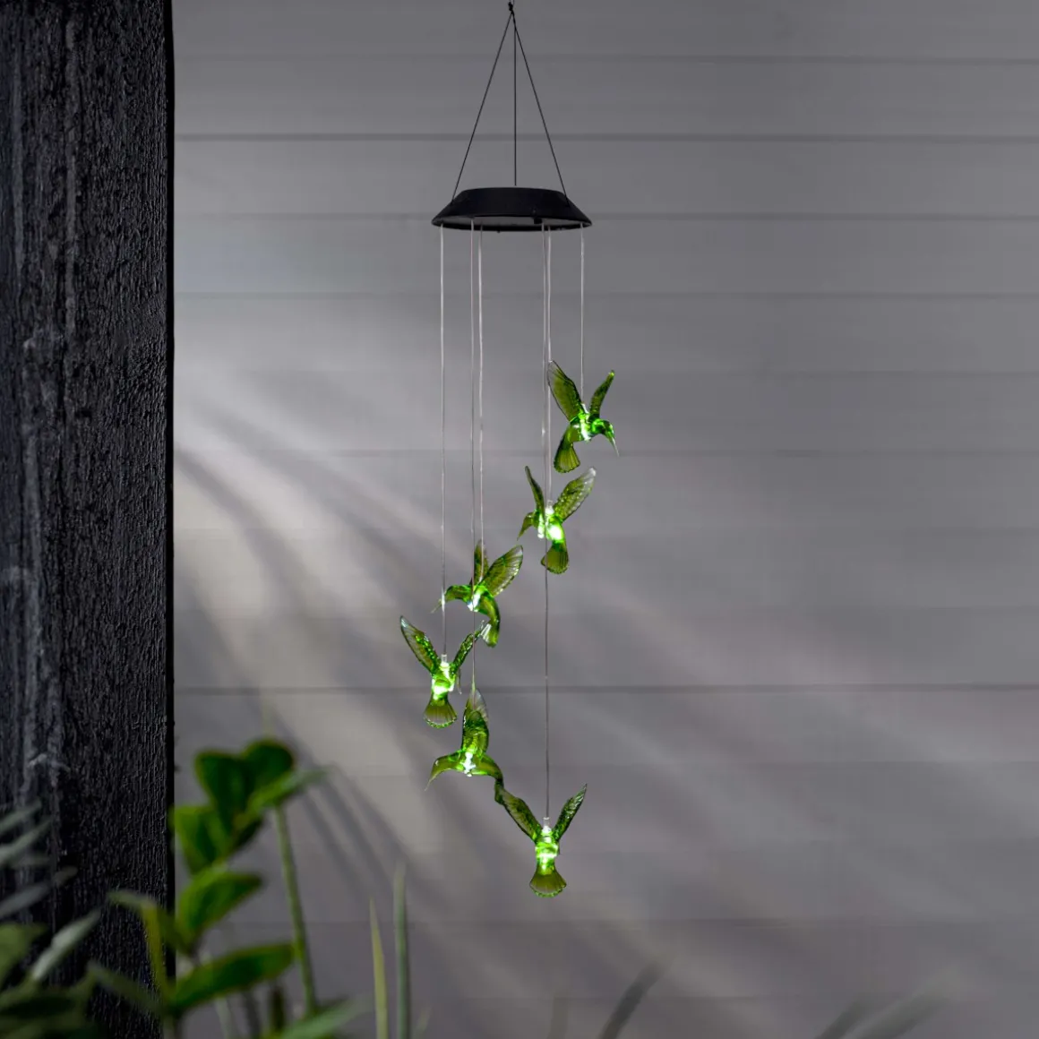 Solcellsdriven mobil från Star Trading med gröna kolibri-fåglar som blir en vacker dekoration i trädgården eller på balkongen. Under dagen pryder de gröna fåglarna din uteplats, och när mörkret faller ger de ifrån sig ett fint ljus. Denna dekorativa mobil skapar en magisk stämning och är perfekt för att lysa upp din utomhusmiljö både dag och natt!