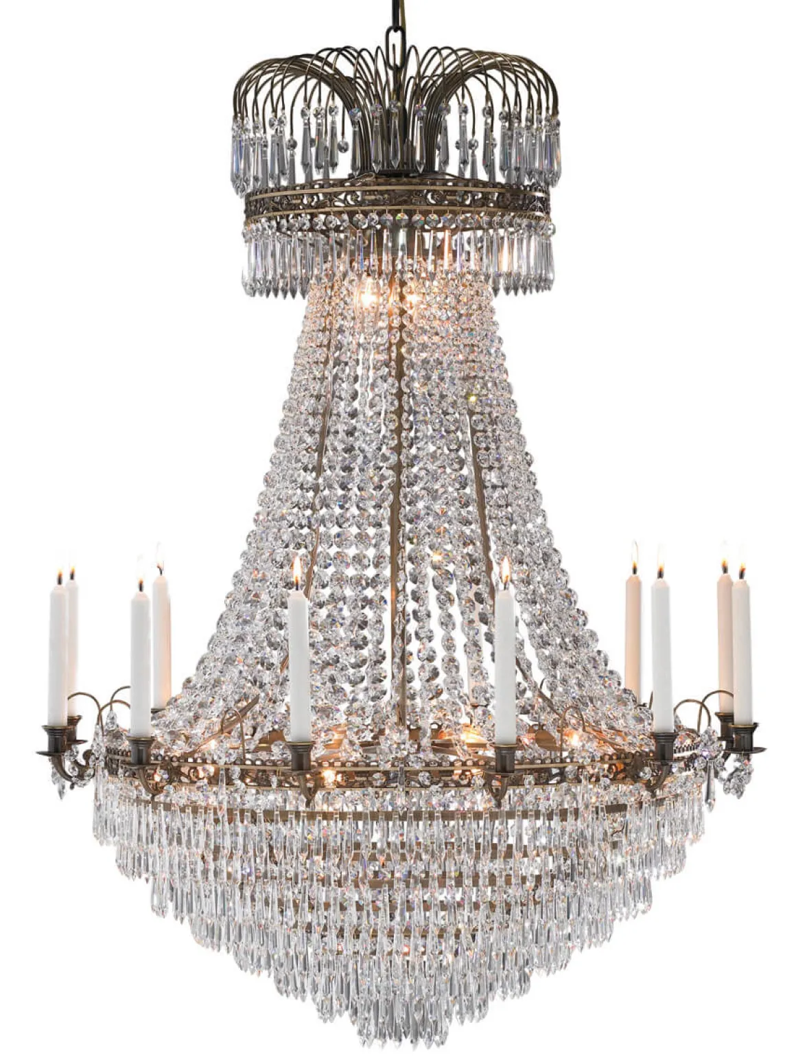 Mycket stor och vacker klassisk kristallkrona i serien Läckö från Markslöjd! Här i antikfärgad metall med hela 18 ljuskällor och en bredd på 1,25 meter!