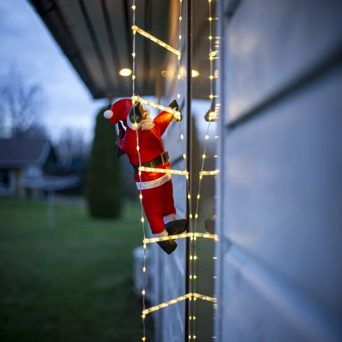 Rolig juldekoration från Star Trading utformad som en stege med en klättrande tomte i polyester. 2 meter hög med chaserfunktion i transformatorn, välj mellan olika blinkfunktioner eller fast sken. 228 st varmvita LED. Lys upp trädgården med denna roliga dekoration!