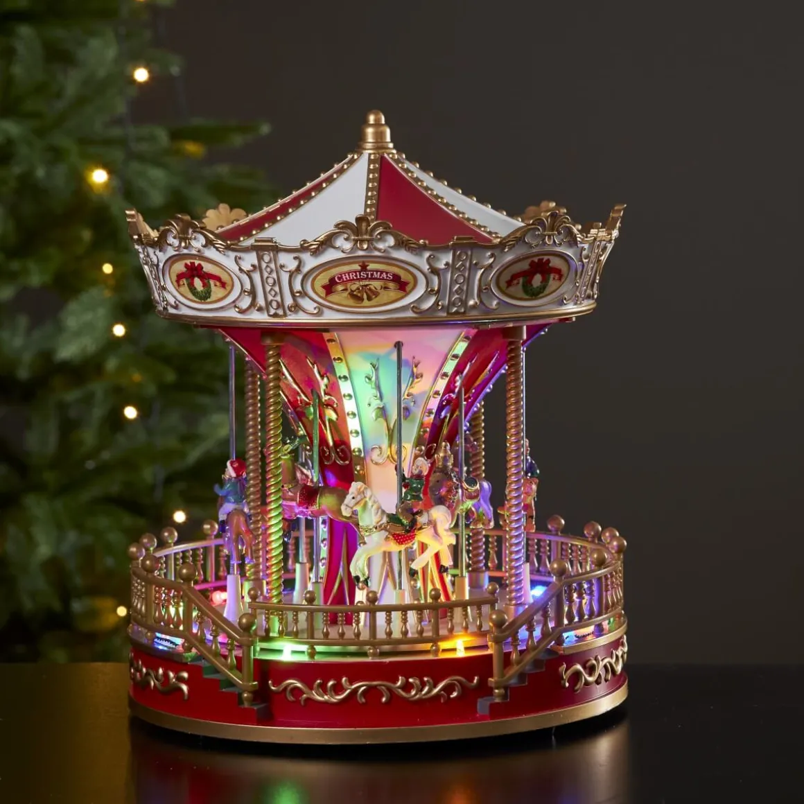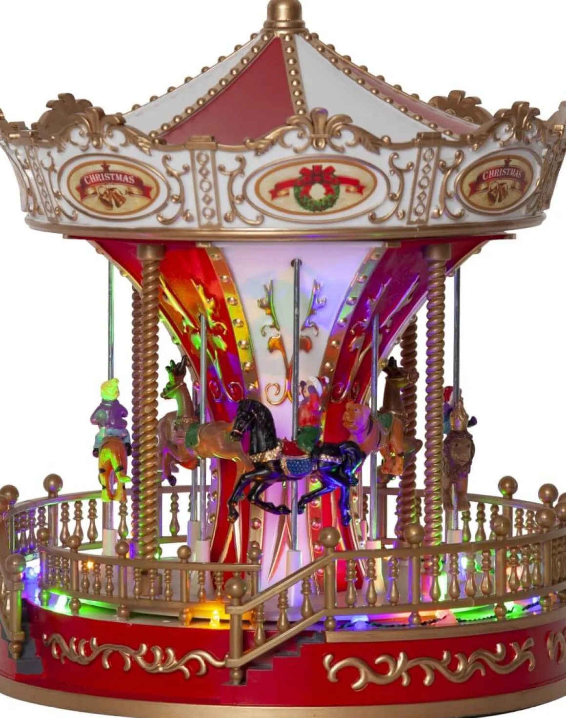 Här är karusellen som ska… tralla lalla la …8 olika (jul) ljudslingor spelas för dig från dennasöta batteridrivna karusell. Du väljer själv om du vill ha den påslagen på endast ljus eller ljus/rörelse/musik.