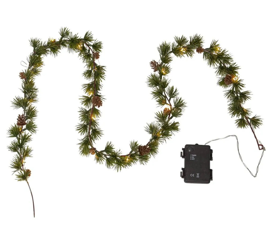 Larix girlang från Star Trading är 140cm lång och har lärkträdsliknande barr och små kottar. Dessa är gjorda i PE material som är ett bra miljöval. Med 20 stycken små varmvita ljuspunkter går den att använda både som en girlang utomhus eller som en dekoration inomhus. Till exempel vid julbuffen. Larix drivs av 3 AA batterier och har även timerfunktion så du enkelt kan styra när du vill att den ska lysa. Batterier ingår ej.