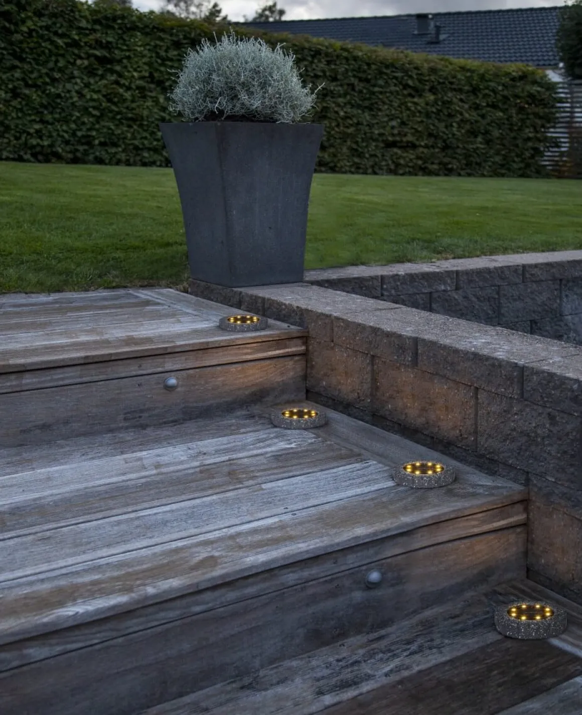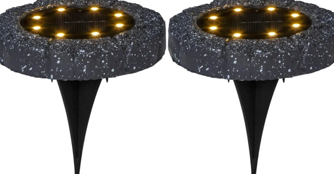 Härligt litet 2-pack med solcellsdrivna markspottar som du enkelt trycker ner i gräsmattan, ger ifrån sig 5 lumen varmvitt sken.