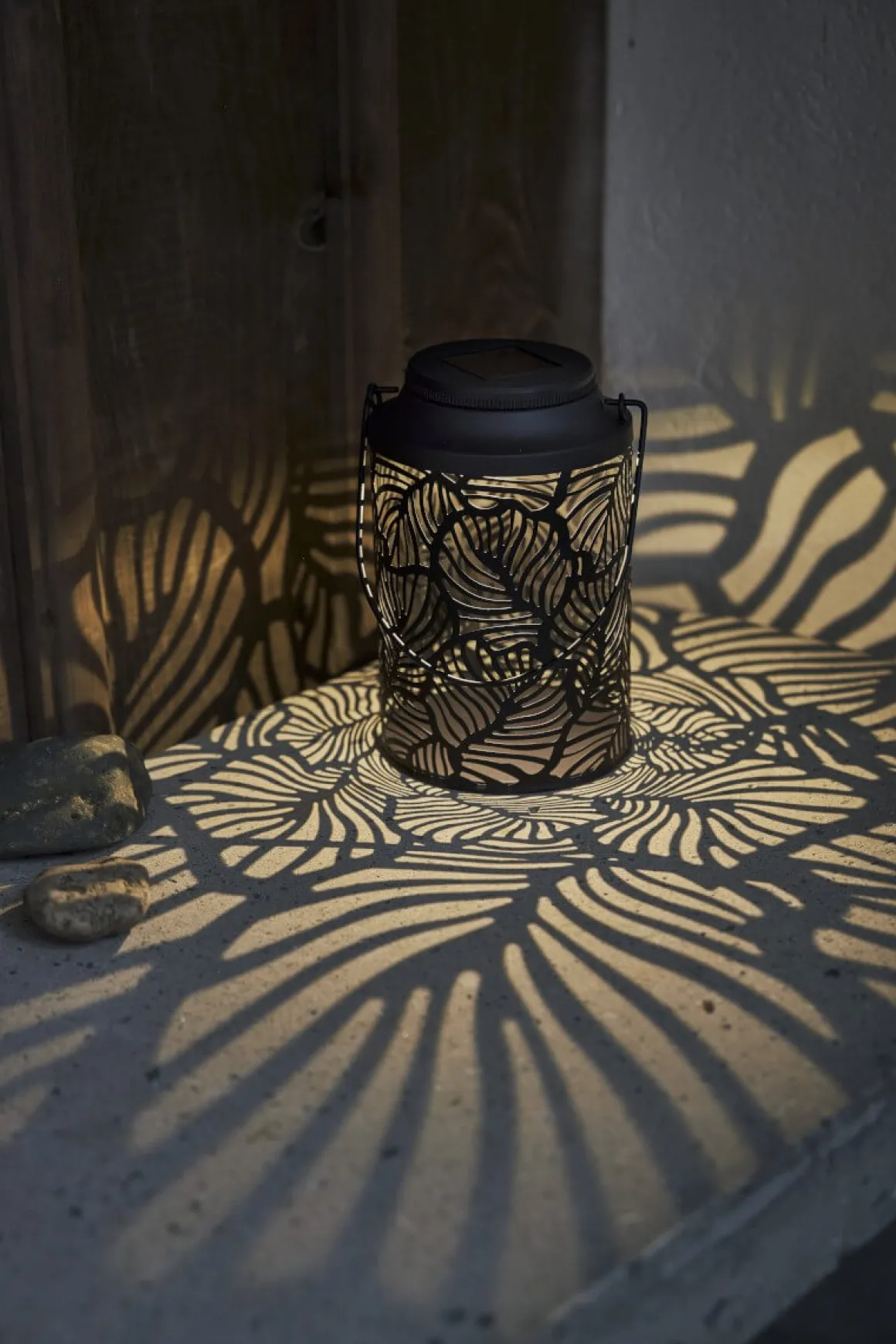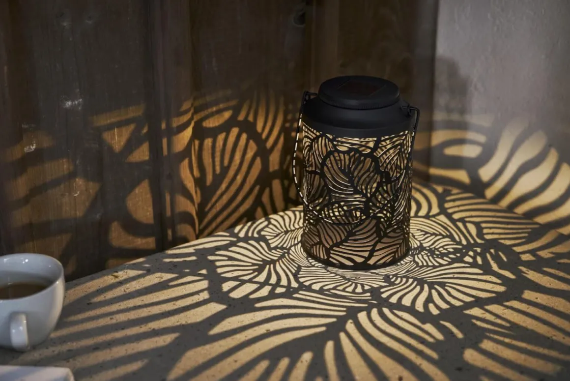 Kolla in Star Tradings fina lykta Leafy! En solcellsbelysning gjord i svart metall. Det varmvita ljuset lyser vackert genom det stansade lövmönstret och bildar en vacker ljusbild runt om sig. Lyktan är fin att placerapå din uteplats, hängande i ett träd eller på en balkong. Se till att placera solcellsdekorationen där solen kan nå solcellspanelen under dagen för att få ordentligt med laddning till det medföljande batteriet.