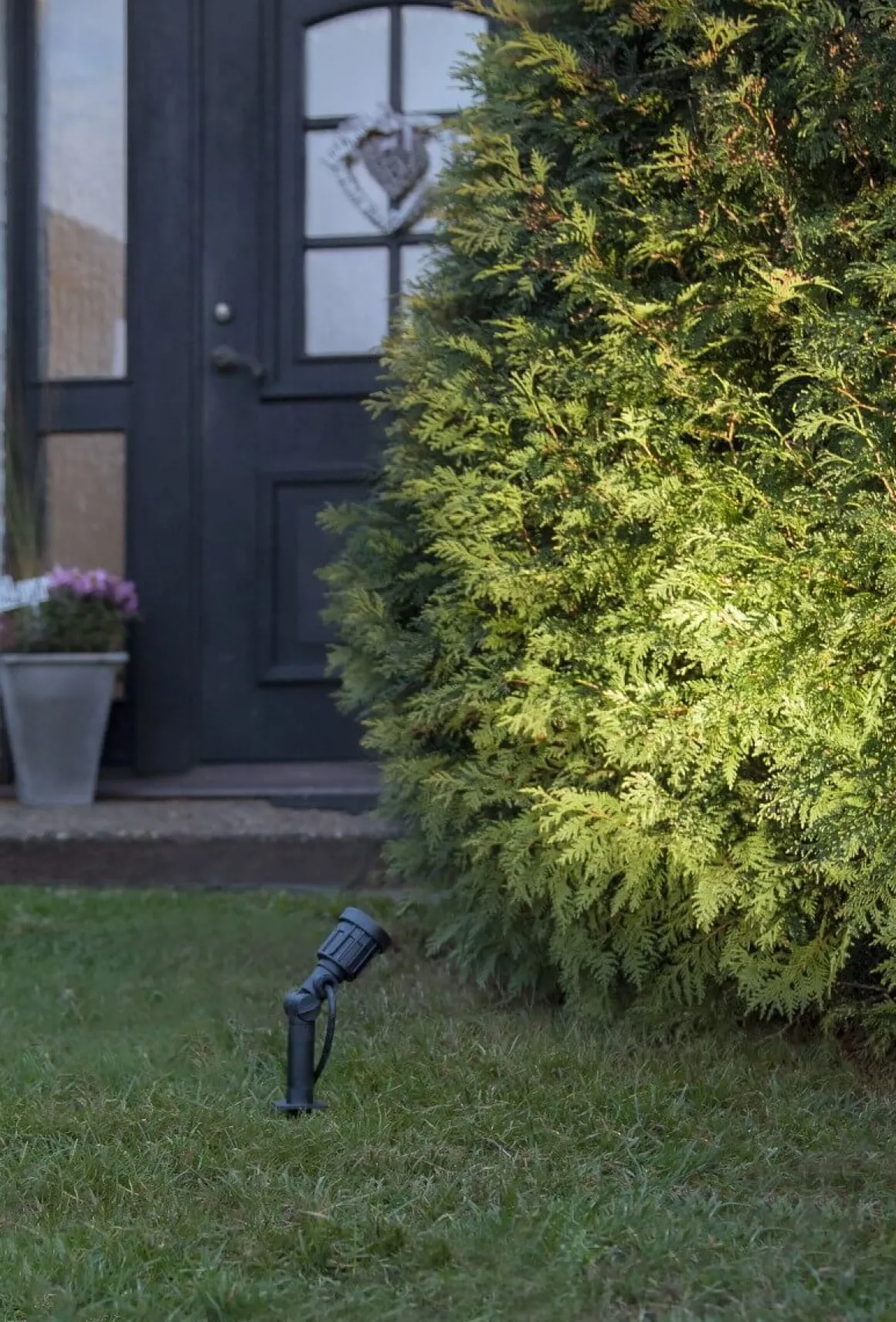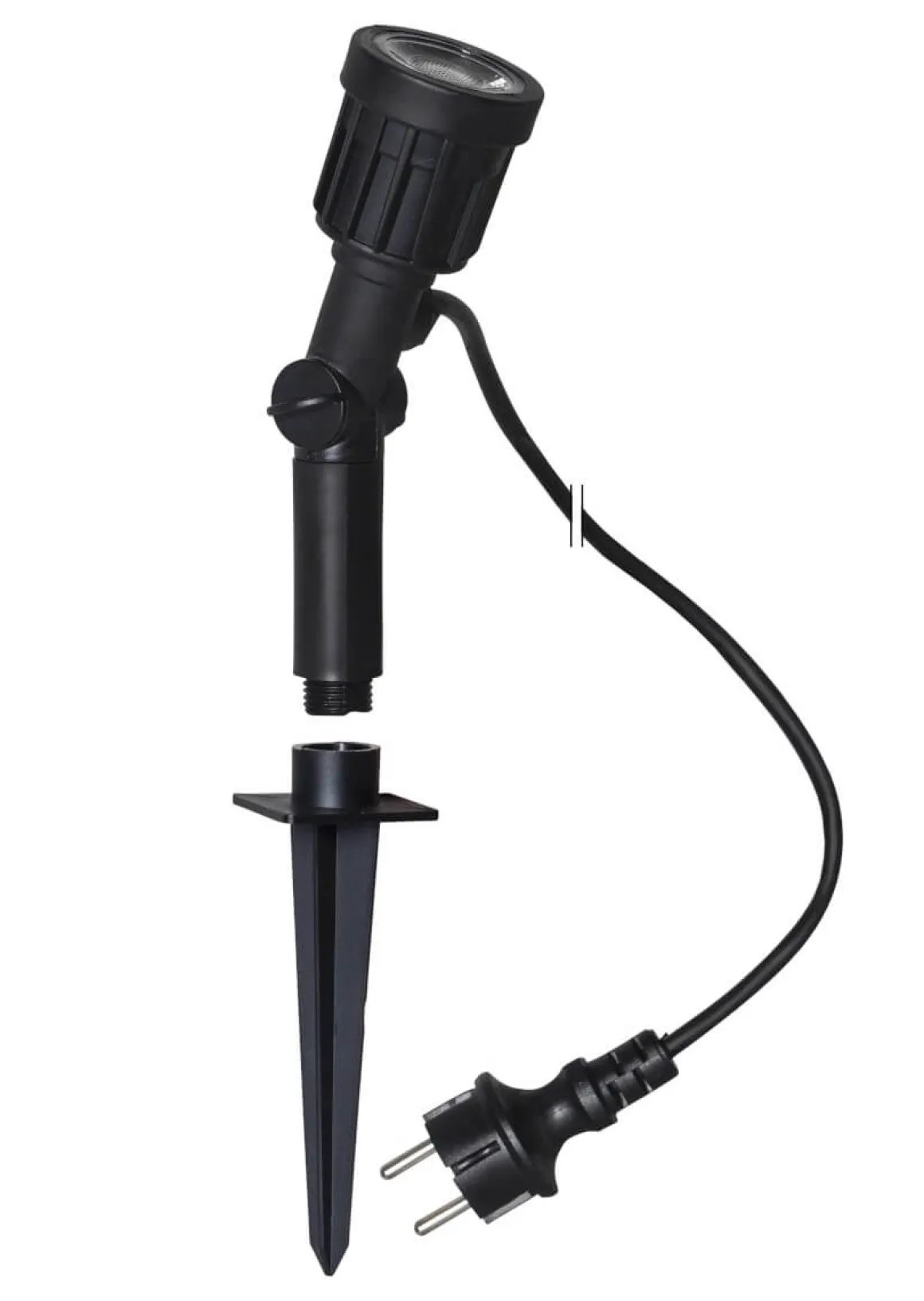 Smidig liten spotlight för utomhusbruk, komplett med integrerad LED lampa och 5 meter anslutningskabel med stickkontakt. Perfekt att belysa ett mindre träd med!