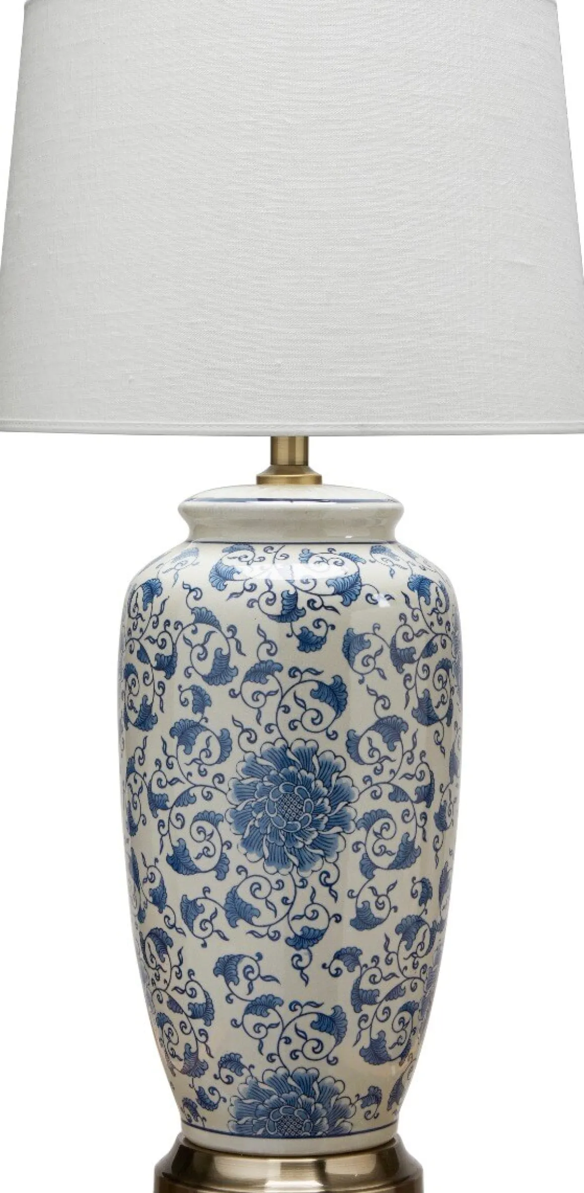 Så läcker handmålad lampfot i vitblå keramik från välkända PR-Home. Serien är tydligt inspirerad av vackert målat kinesiskt porslin. Låt foten tala för sig själv och kombinera den med en enfärgad sammetsskärm.