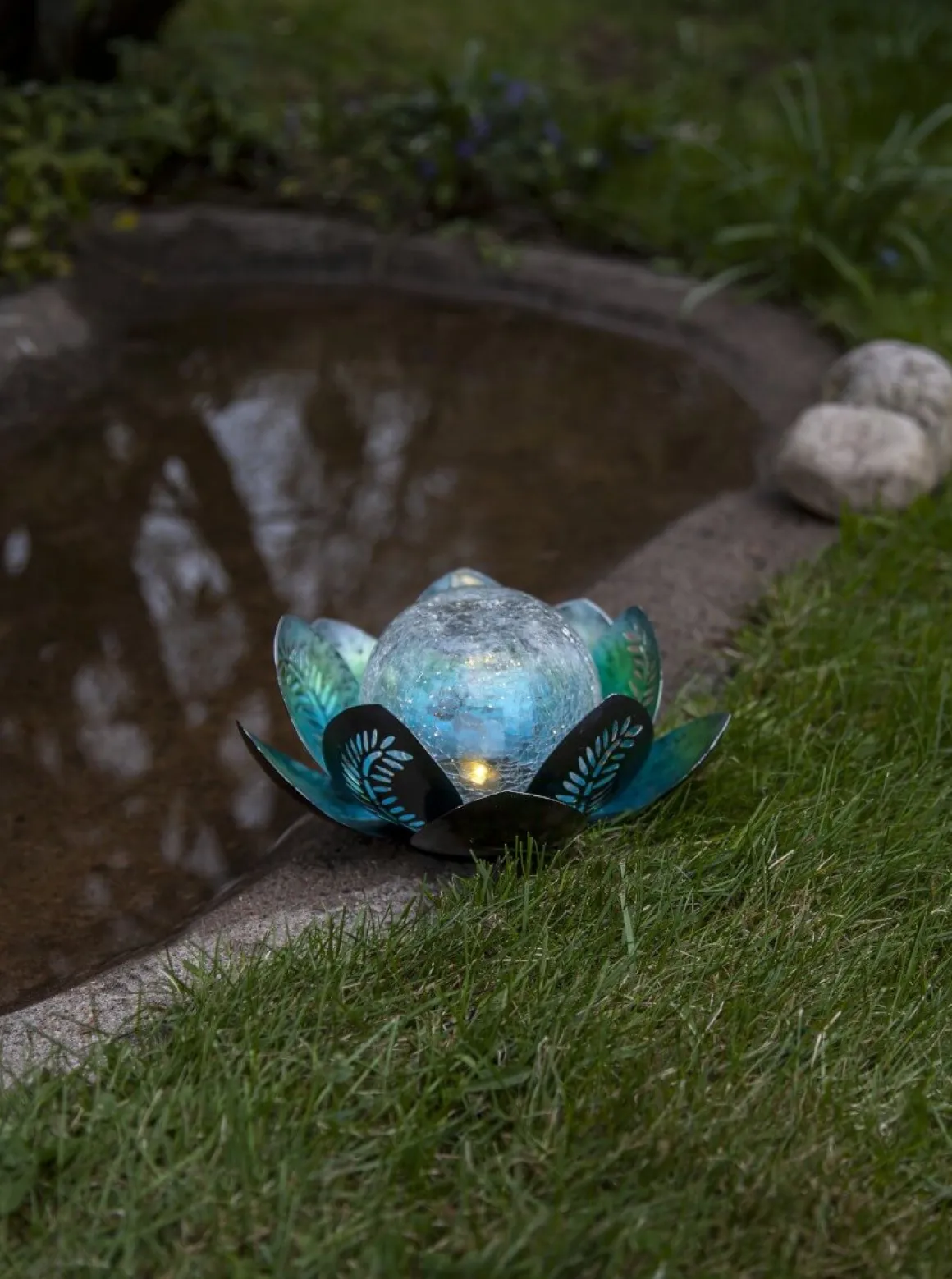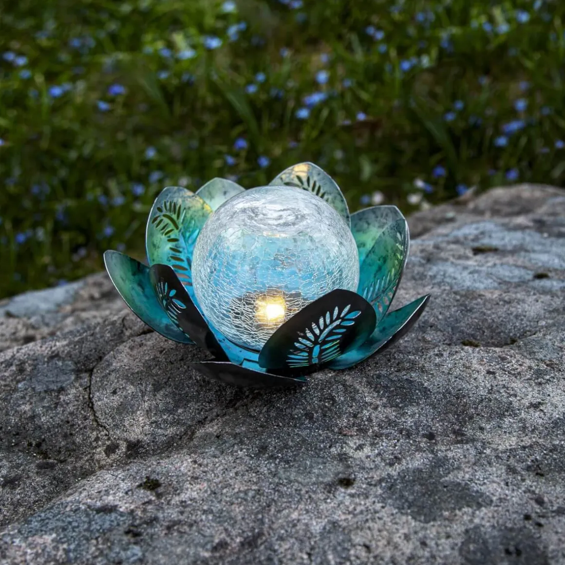 Helt underbart vackra solcellsdrivna dekoration Lilly har silver-blå metall löv med en stor transparent glaskula inuti.. Lilly är ca 24 cm i diameter och 12 cm hög. Hon lyser med ett varmt sken genom glaskulan. Denna solcellsdekoration är så fin att dekorera med i trädgården eller på en balkong. Se till att placera belysningen där solen kan nå panelen under dagen för att få ultimat laddning till det medföljande batteriet.
