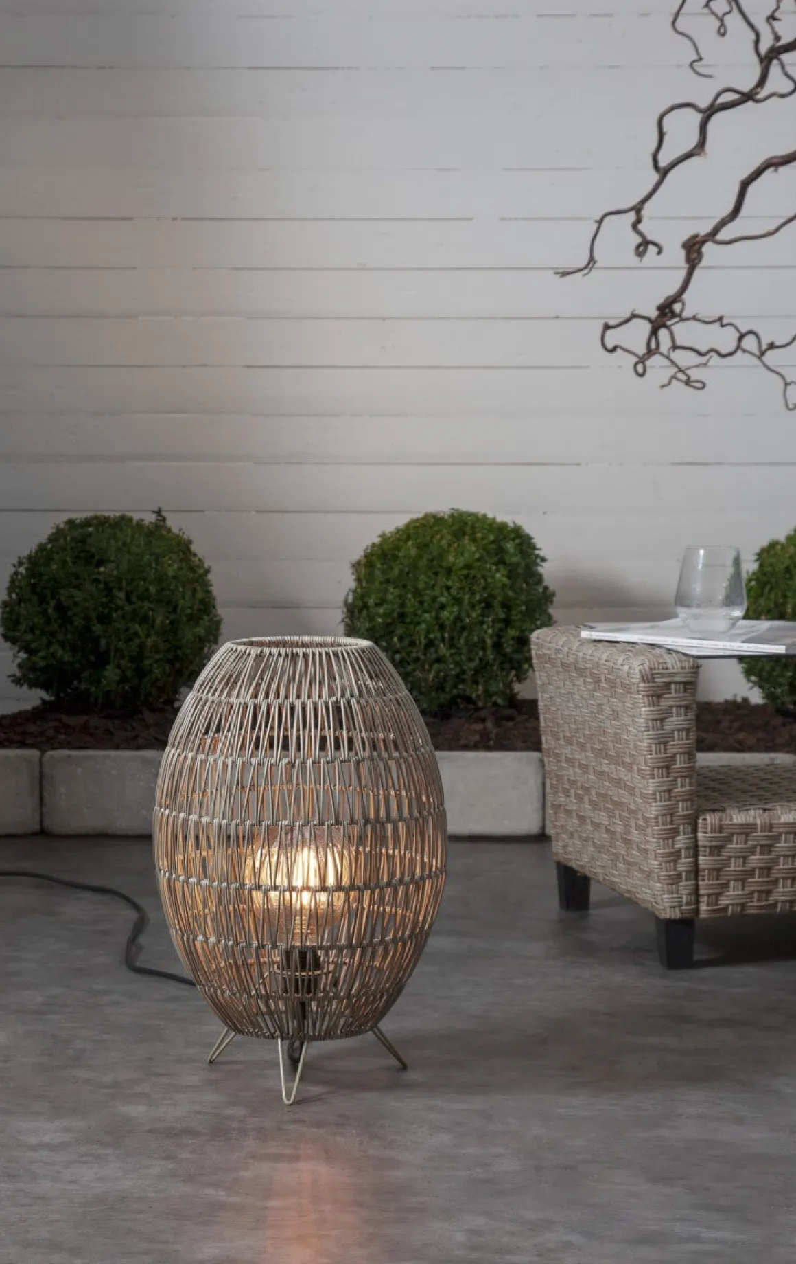 Gråbeige 46 cm hög golvlampskärm i rotting för utomhusbruk. Mixa och matcha med ditt eget val avutomhusupphäng och ljuskälla. Passar lämpligast till E27 sockel.