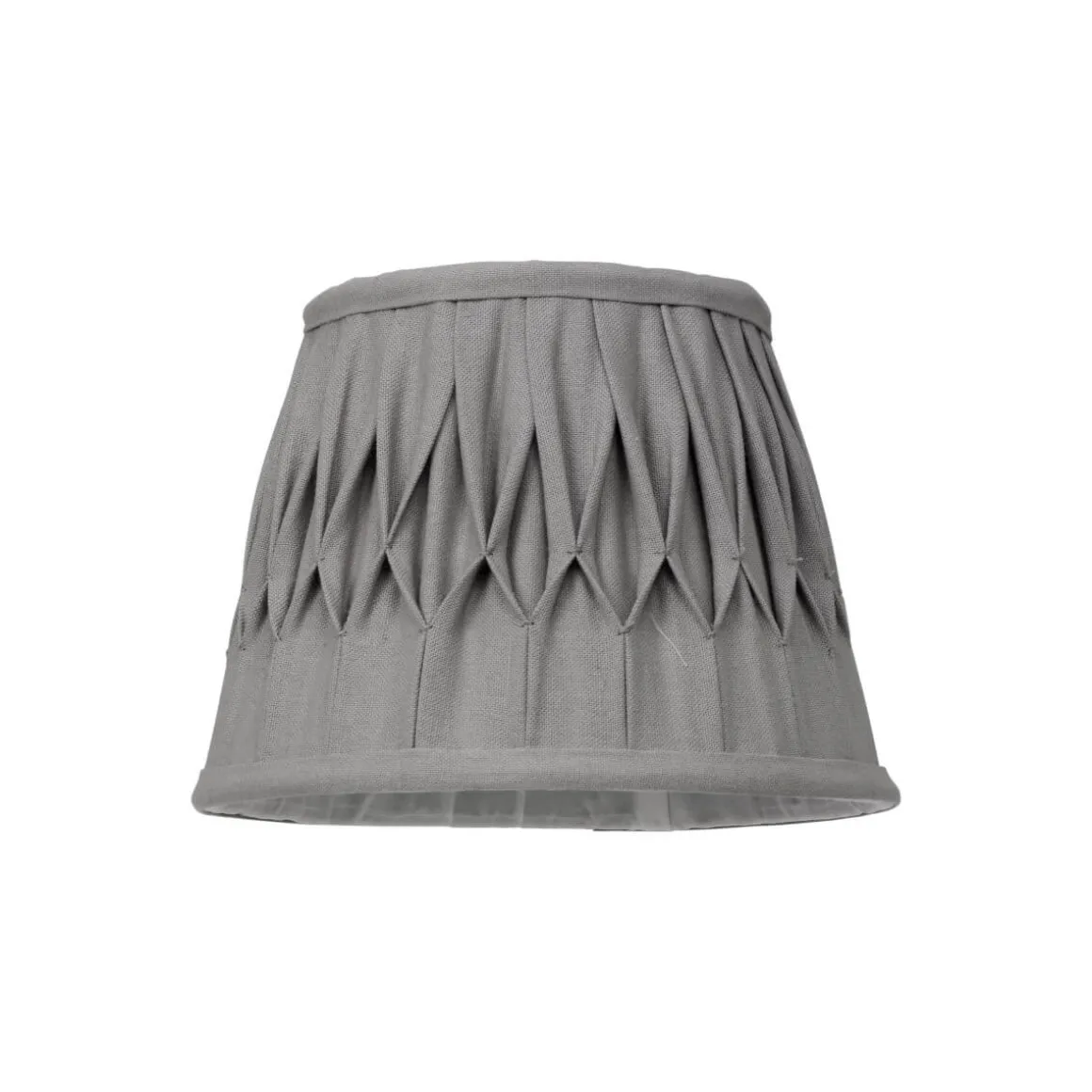 Grå Veckad Linne lampskärm från Cottex med en höjd på 14,5 cm. Skärmen har bredden uppe 13cm, nere 20cm och har klotfäste.