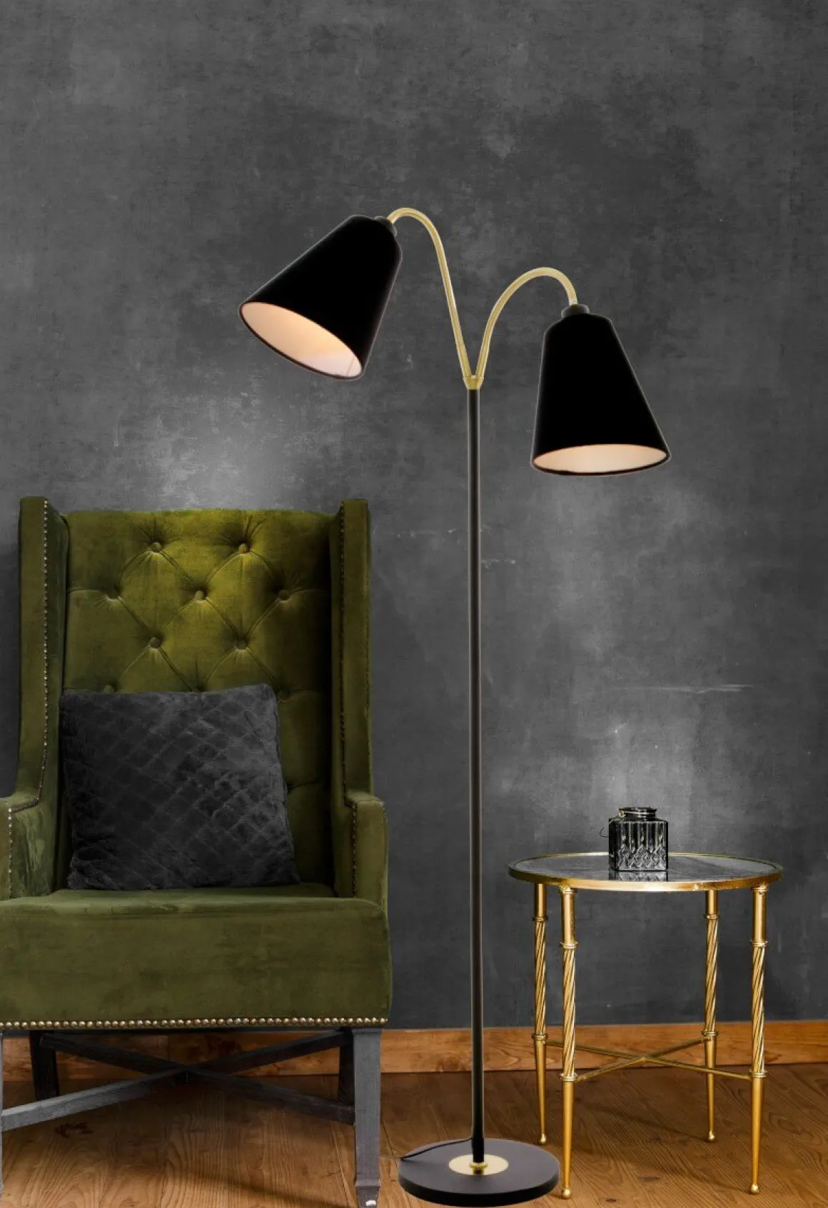 Perfekt golvläslampa från Aneta där du själv får välja vilken skärm du vill pryda underverket med. Ljusdal finns i lite olika färgar och olika antal armar. Här ser du Ljusdal i svart/matt mässing med två läsarmar.