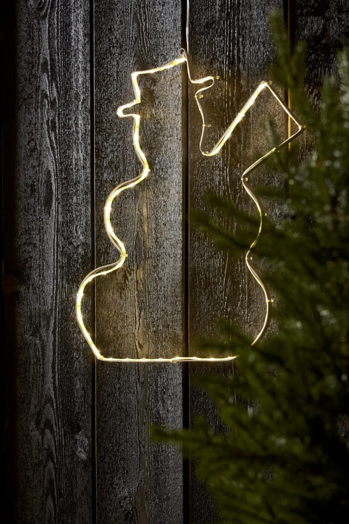 Härlig siluett snögubbe för utomhusbruk från Star Trading. Snögubben har 60 små LED-ljuskällor med varmvitt behagligt sken. En underbar juldekoration att ha hängandes i trädgården.