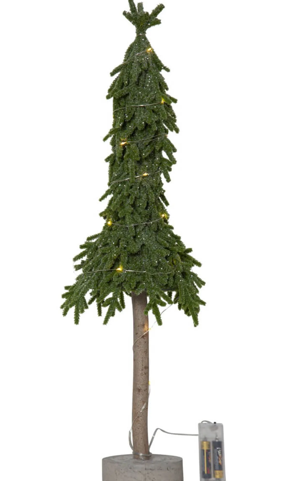Bordsgran från Star Trading helt i PE material med lite glitter och fot av grå cement. Den höga lummer som du ser här lyser upp med 20 små varmvita dew drops.