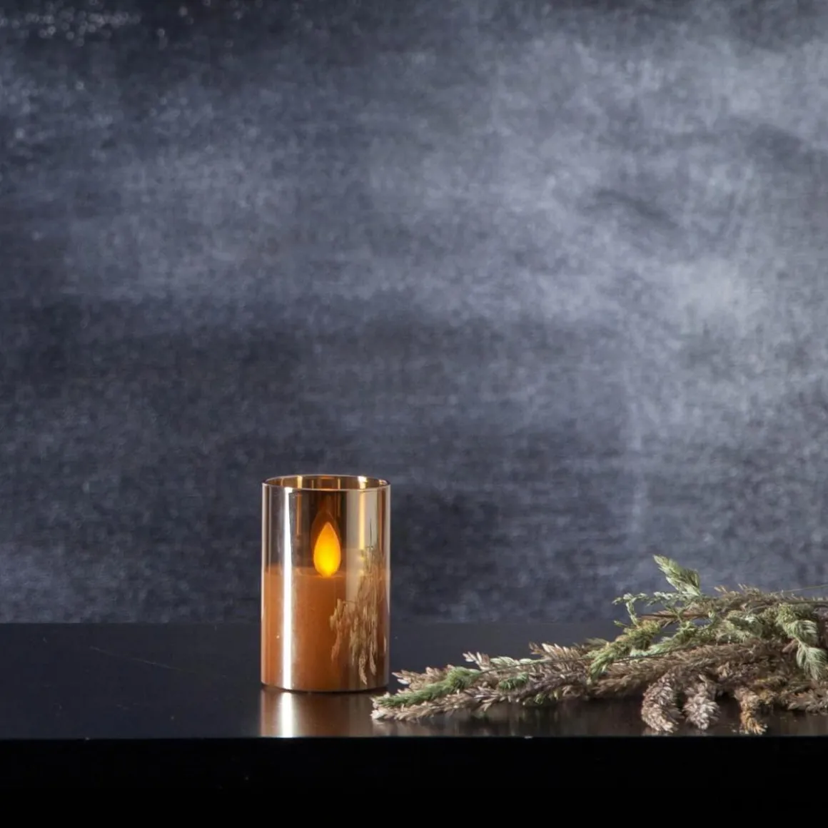 Amber färgad glashållare med vaxljus inuti, Twinkle flamman lyser med ett naturligt varmt och behagligt gult sken. Timerfunktionen gör det enkelt att ställa in när ljuset ska lysa. Finns i flera storlekar här ser du den som är 7,5 cm hög