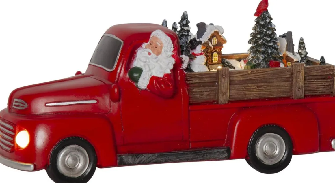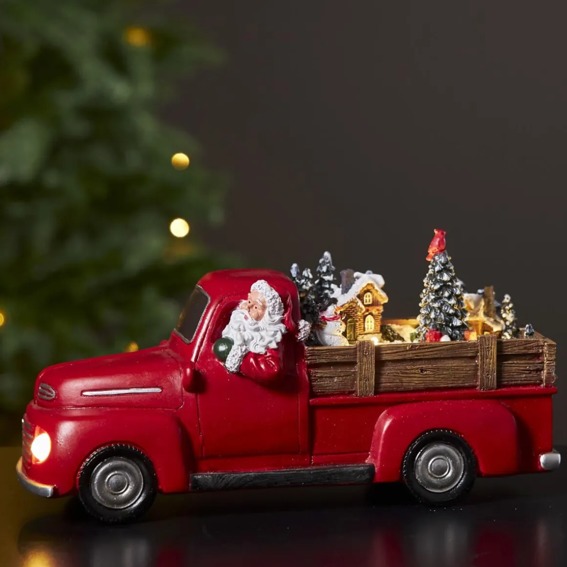 En vacker juldekoration från Star Trading, tomten i sin röda lastbil, lastad med ett vintrigt landskap som lyser varmt och fint. Julgranen roterar sakta samtidigt som ljuslyktorna fram på lastbilen lyser. Dekorera till advent och jul, passar både barnrummet och på en hylla eller skänk.