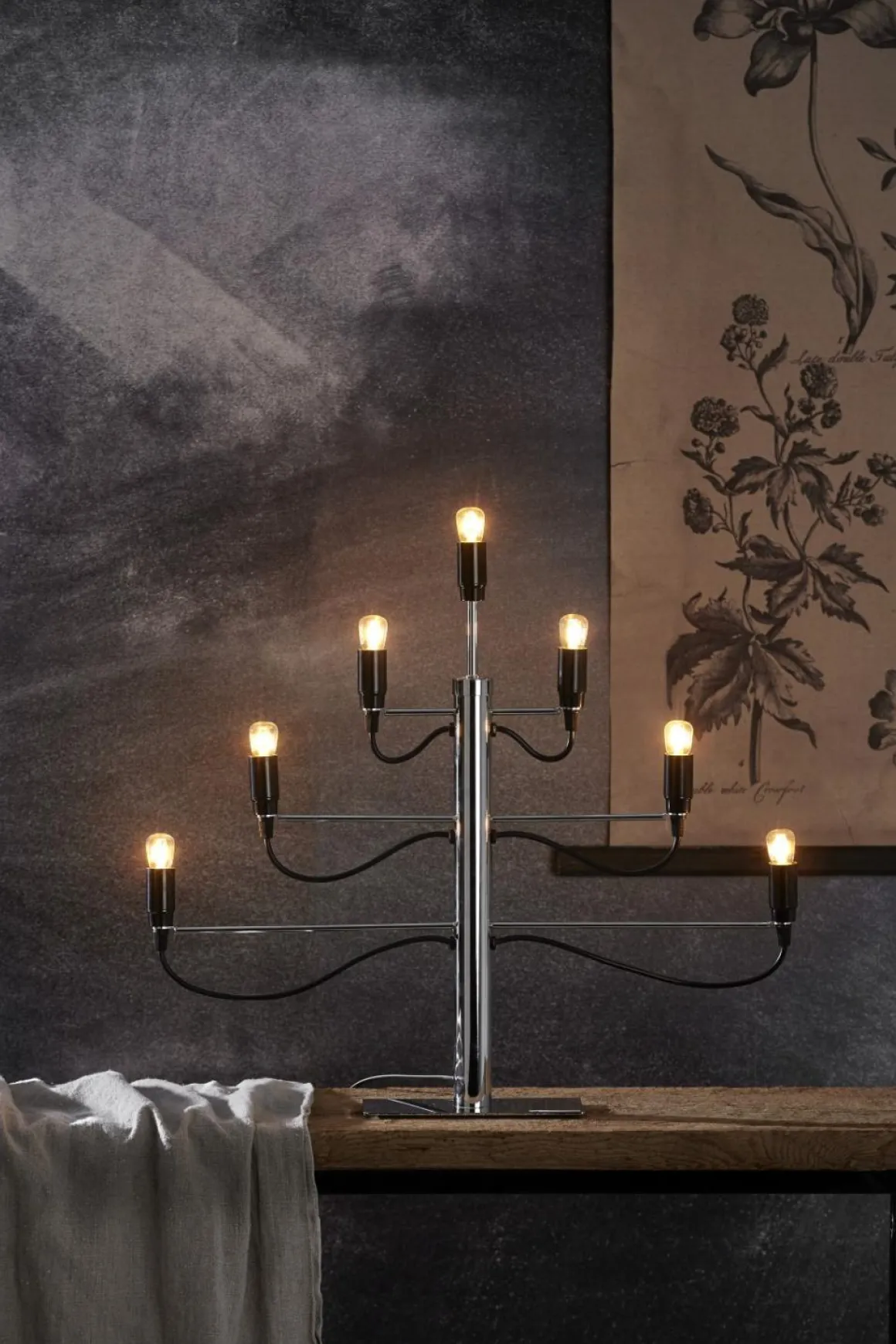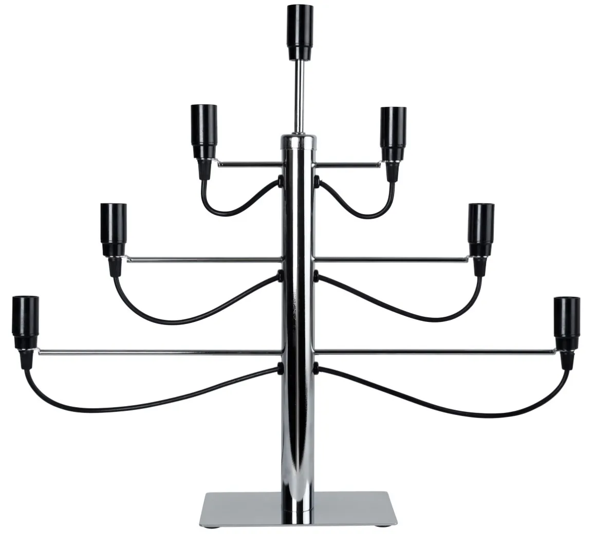 En riktigt tuff ljusstake för den som vågar ta ut svängarna! Med 7 stycken E14 ljuskällor bestämmer du själv vilken typ av lampa du vill ha i den. Det finns många varianter, bara att börja designa som du vill ha det!
