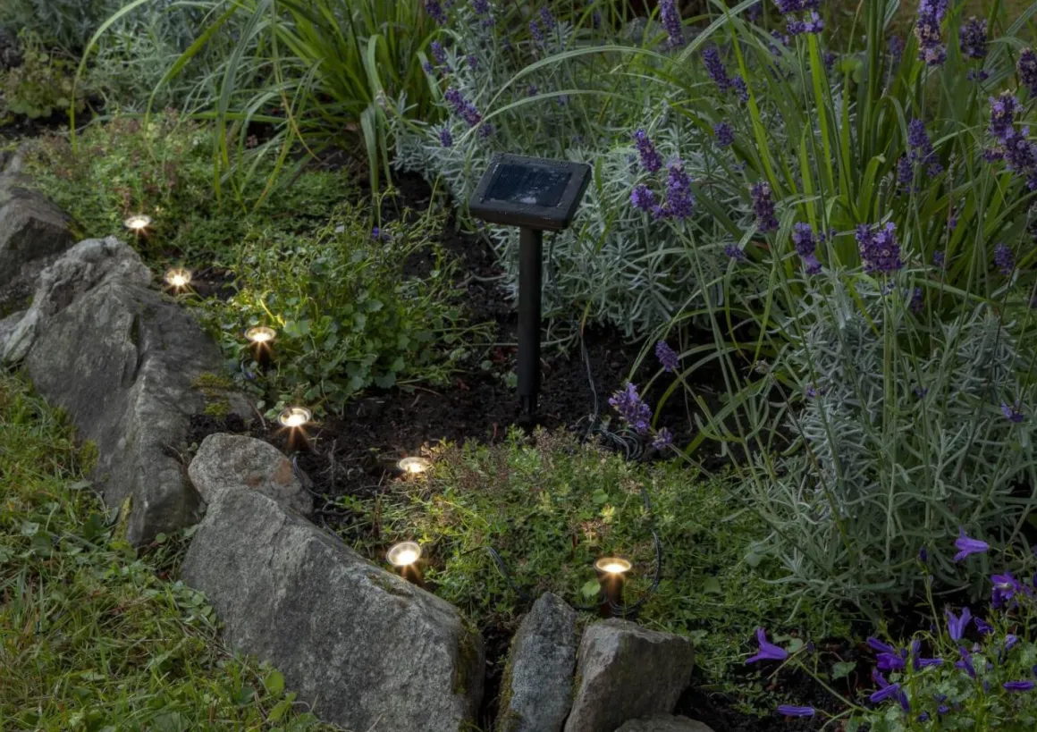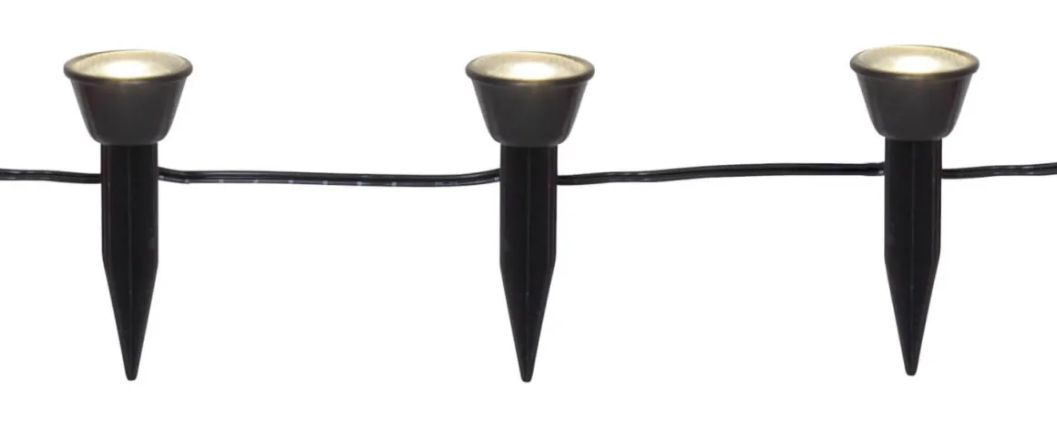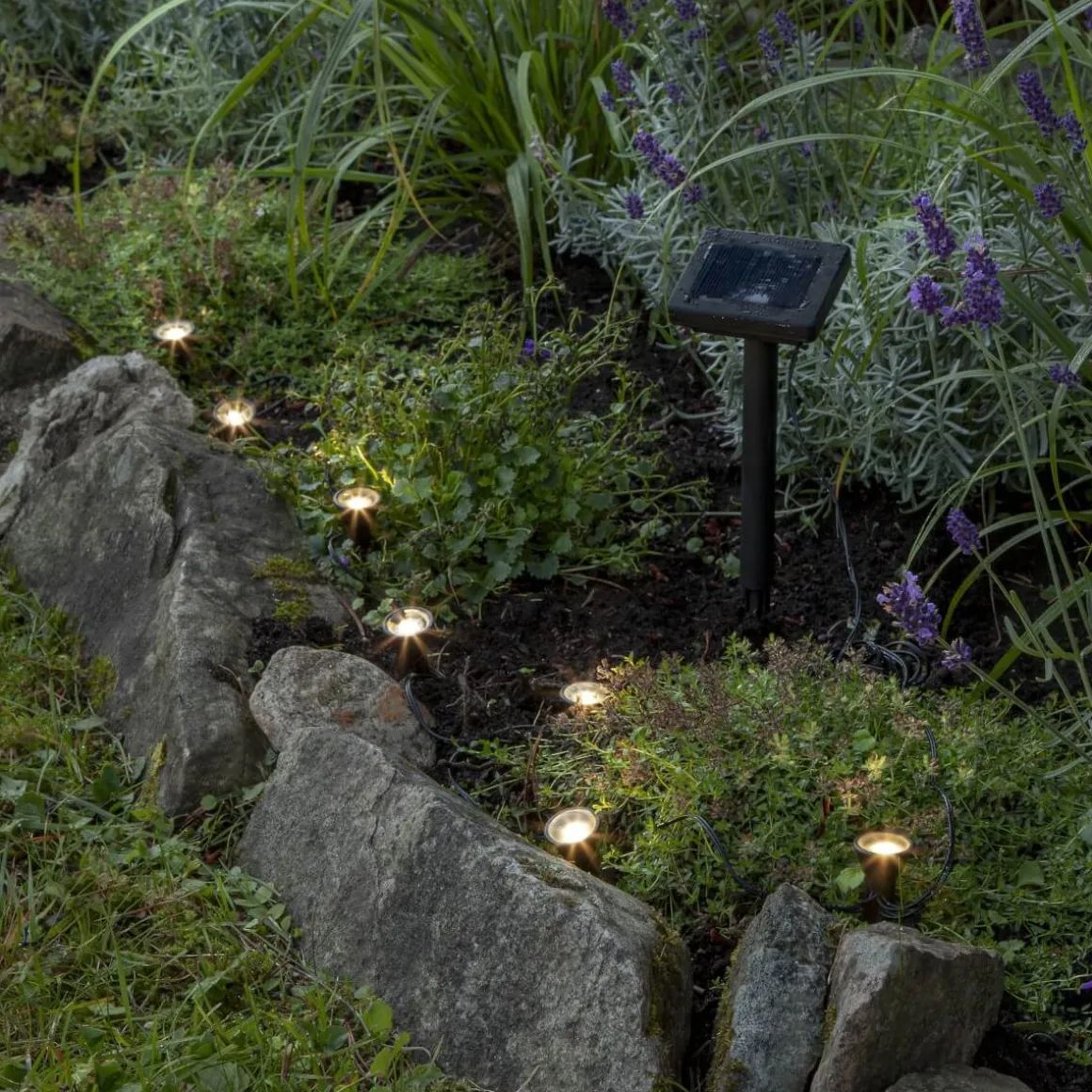 Solcellsslinga från Star Trading med 8 supersöta mini spotlights med 30 cm kabel emellan. Dessa spotlights lyser upp i din trädgård eller på terrassen med 25 lumen. De är diskreta och lätta att placera i en rabattkant eller som en enklare gångbelysning. Själva paneldelen sitter med 170 cm kabel från den sista spotlighten detta gör det enkelt för dig att placera panelen i direkt solljus vilket är nödvändigt för att ladda batteriet som medföljer. Det går således bra att ha själva slingan i skuggan så länge själva panelen står i solen.