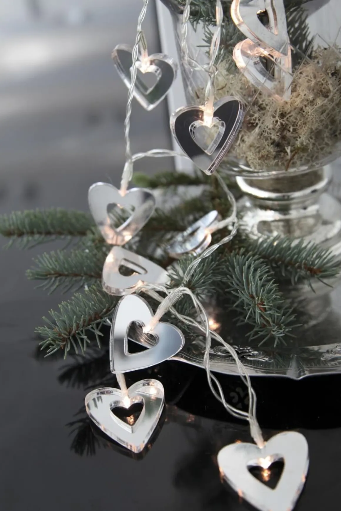 Vacker dekorationsslinga med 10 stycken LED-ljus i spegelhjärtan. Kan användas vid diverse dekorationer, vid tex dukningar, blomsterarrangemang, på väggen osv. Slingan är batteridriven och har en smidig timerfunktion.