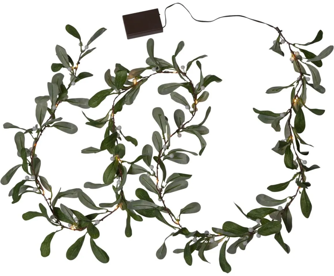Vacker mistel girlang från Star Trading att dekorera med. Lyser med 20 varmvita dew drops mellan de gröna bladen. Går att lysa upp med timer eller utan.