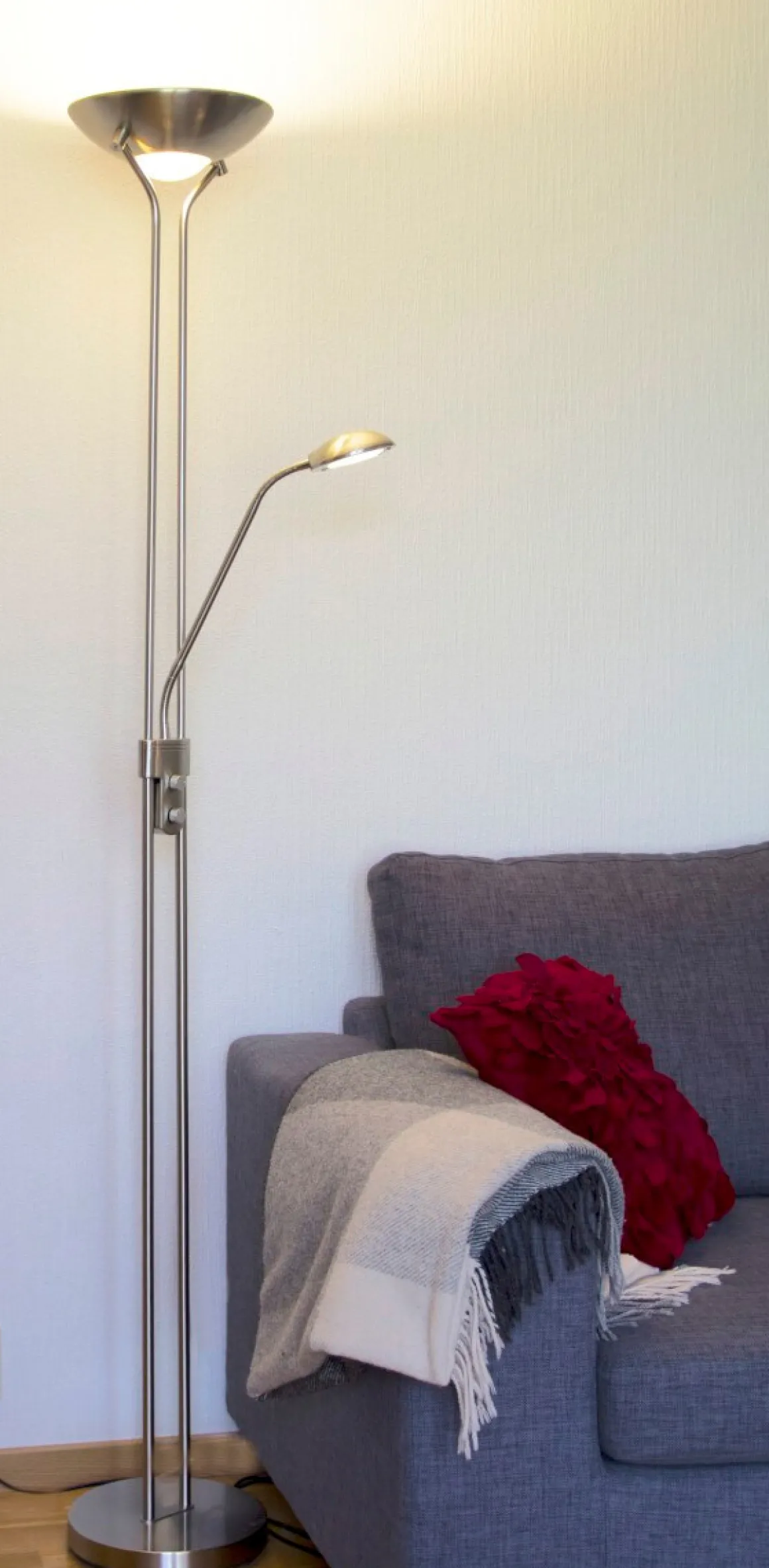 En klassisk Up-light i borstad stål från Aneta belysning! Topplampan lyser med enkelhet upp ditt rum medan läslampan ger dig ett riktat ljus. En favorit i många hem!