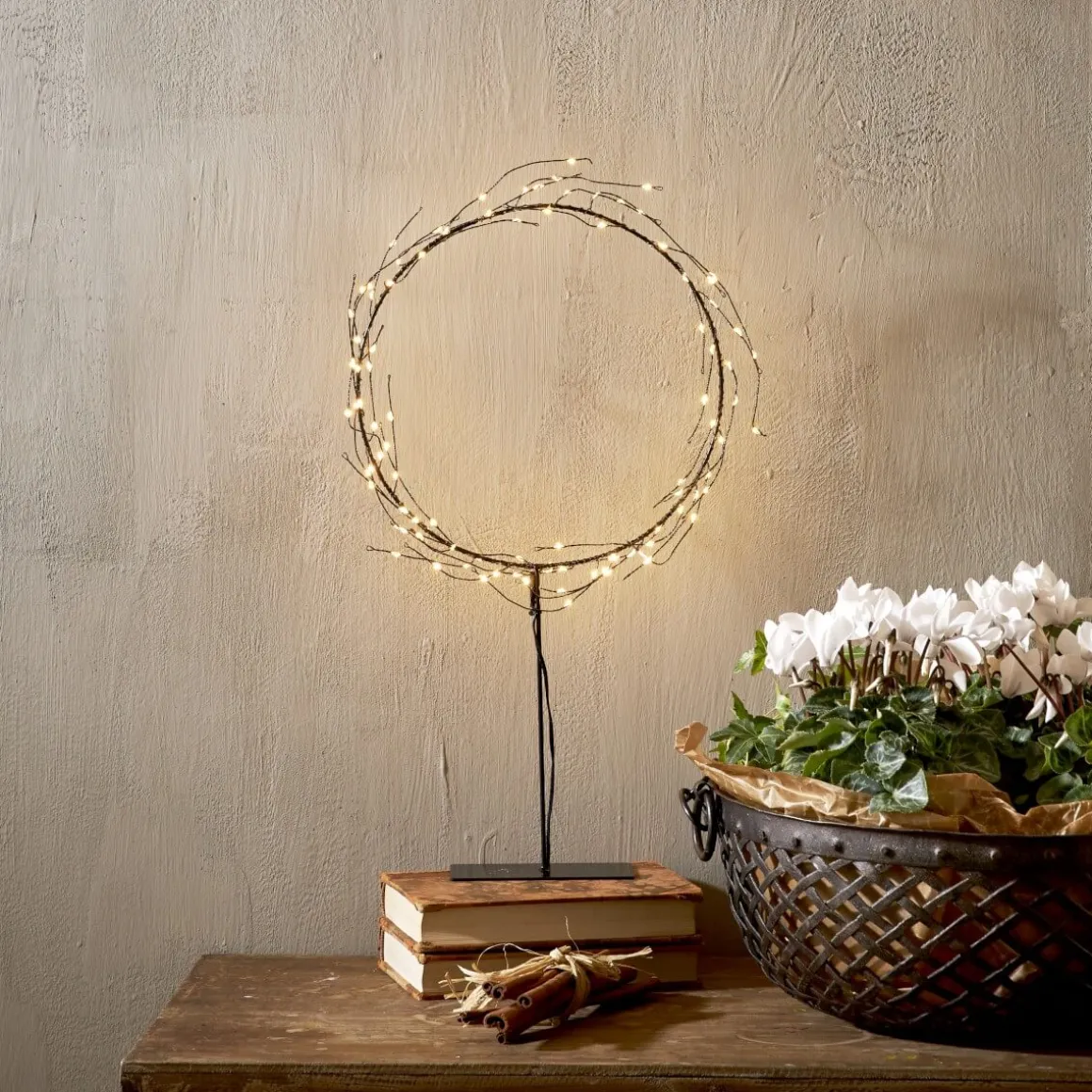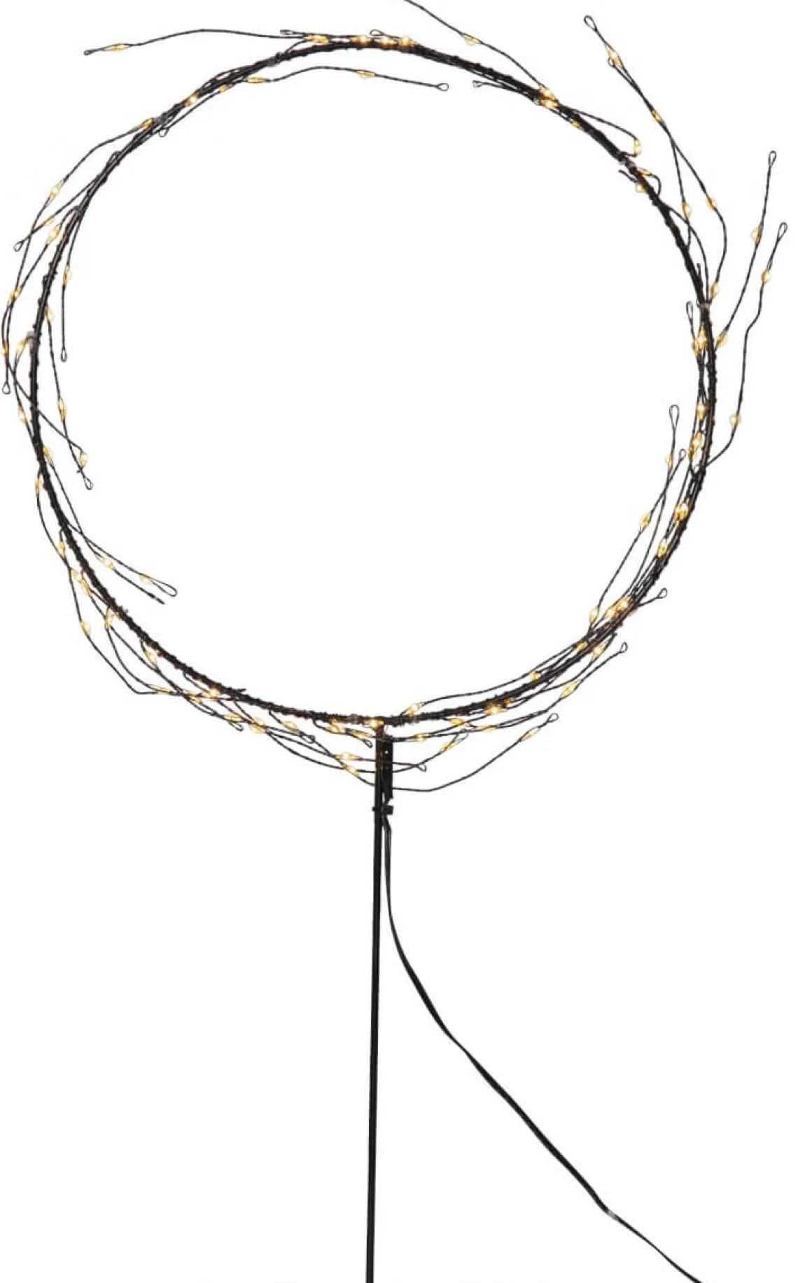 Stämningsfull krans på en nätt fot i svartmålad metall, 95 små varmvita ledpunkter lyser fint i mörkret. Dekorerar till jul och advent eller varför inte så fort den mörka årstiden börjar. Nike passar lika bra i fönstret som på diskbänken eller varför inte på byrån i hallen?
