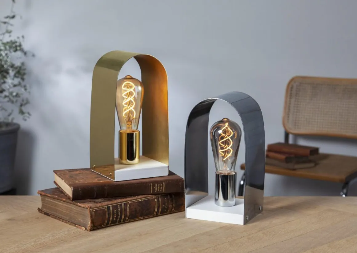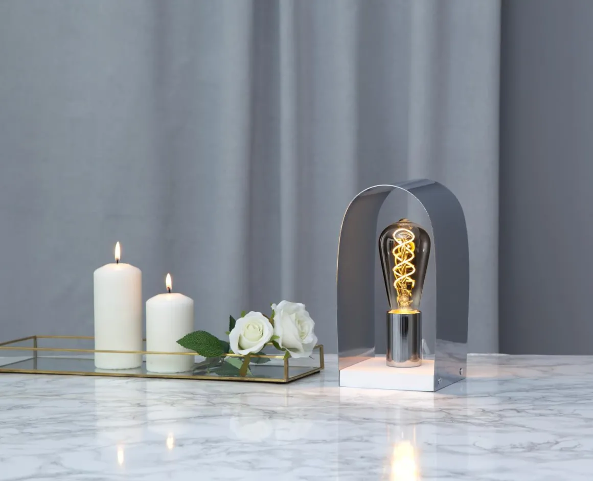 Vit lampfot med en läcker kromfärgad båge som reflekterar ljuset samtidigt som den avskärmar. Kombinera lampfoten med en snygg ljuskälla för ett modernt utseende. E27-sockel!
