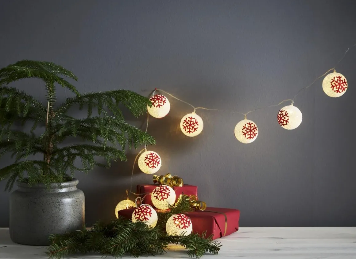 Batteridriven ljusslinga från Star Trading fint dekorerad med 10 bollar med julmotiv i rött och vitt. Placera ljusslingan på ett bord eller i julgranen. Dekorativ inredning som ger ett mysigt sken i hemmet.