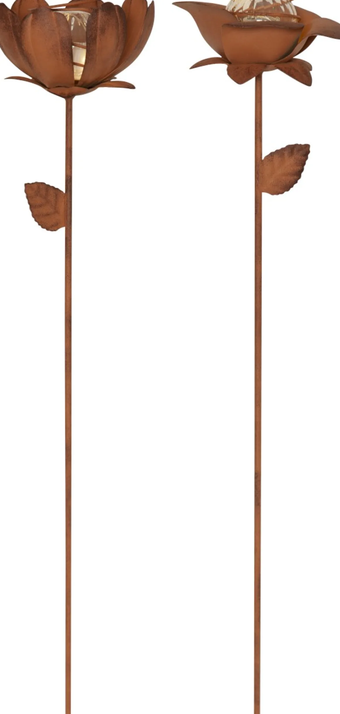 Lättplacerade små söta solcellsbelysningar med formen av två olika blommor som lyser upp av sig själv när det mörknar. Lyser gör dem med ett varmt och behagligt sken som blinkar lite lätt i mörkret.