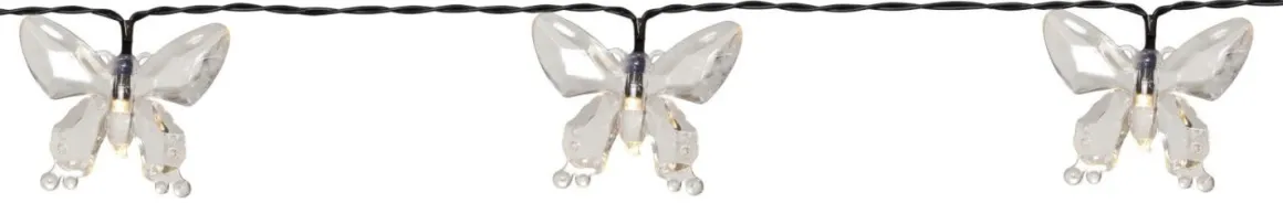 Kolla in Star Tradings vackra solcellsdrivna slinga Papillon med 15 små söta akrylfjärilar som lyser upp i mörkret med ett varmvitt behagligt sken. Denna solcellsbelysning har 20 cm mellan ljuspunkterna som ger en 280cm lång slinga. Själva paneldelen sitter med 1 meters kabel från den sista fjärilen, detta gör det enkelt att placera panelen i direkt solljus vilket är nödvändigt för att ladda batteriet som medföljer.