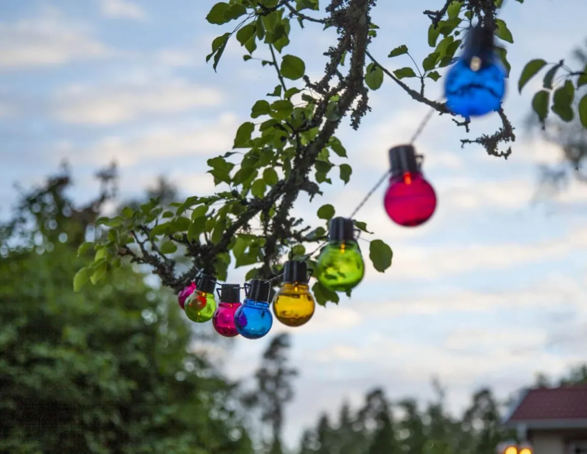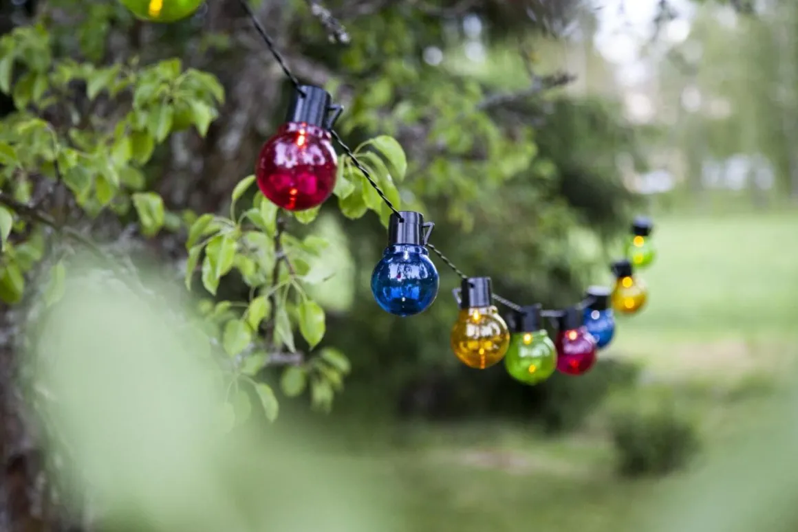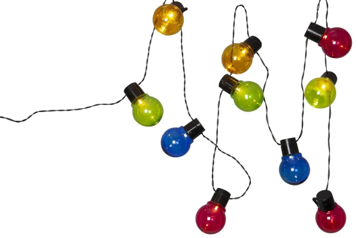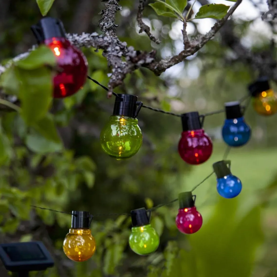 En riktig kundfavorit! Solcellsdriven Ljusslinga med 10 stycken olikfärgade glödlampor som lyser upp i mörkret. Separat solcellspanel så du kan ha slingan i skuggan och solpanelen i solen – toppen! Eller lysande skulle man kunna säga.