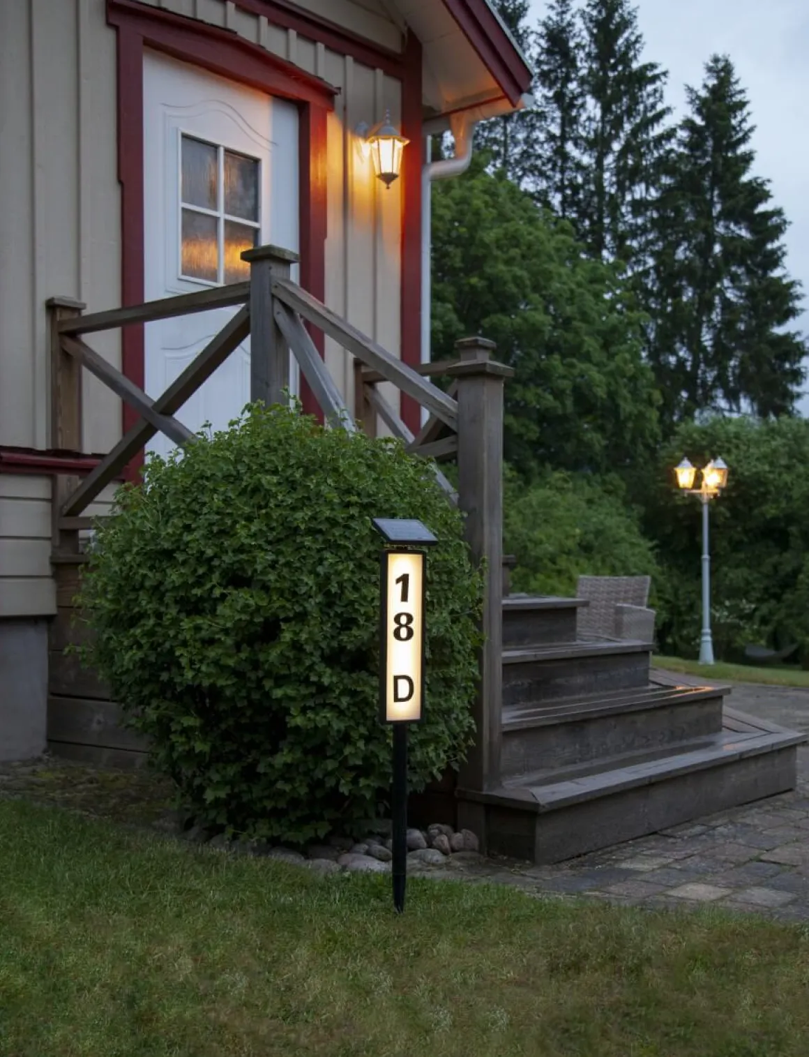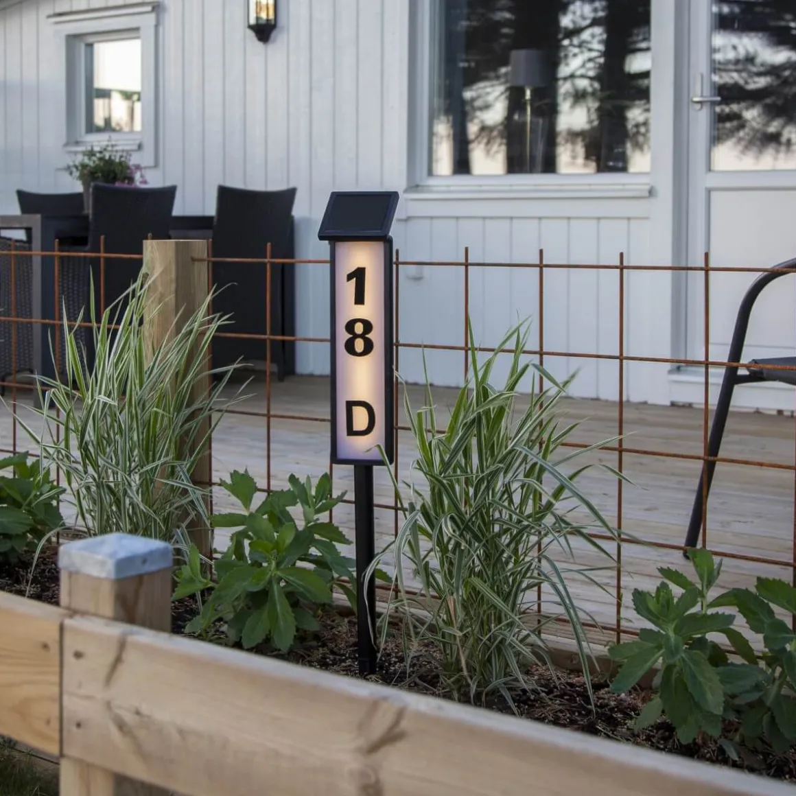 Solcellsdriven gångbelysning med möjlighet att sätta på husnummer. 2 set med etiketter 0 – 9 och 1 set med etikett a – f medföljer. Laddas av solens varma strålar under dagen för att lysa upp med ett varmvitt mjukt sken under natten.