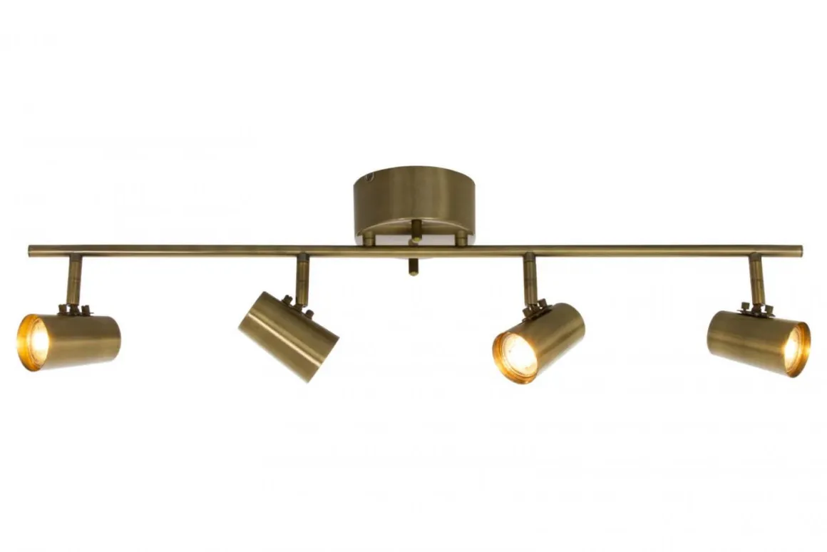 Perfekt basspotlight från Aneta med krokupphäng och fyra riktbara spotlights i antikmässing. Här ser du Pilot som en rak taklampa men den finns även i rund modell..