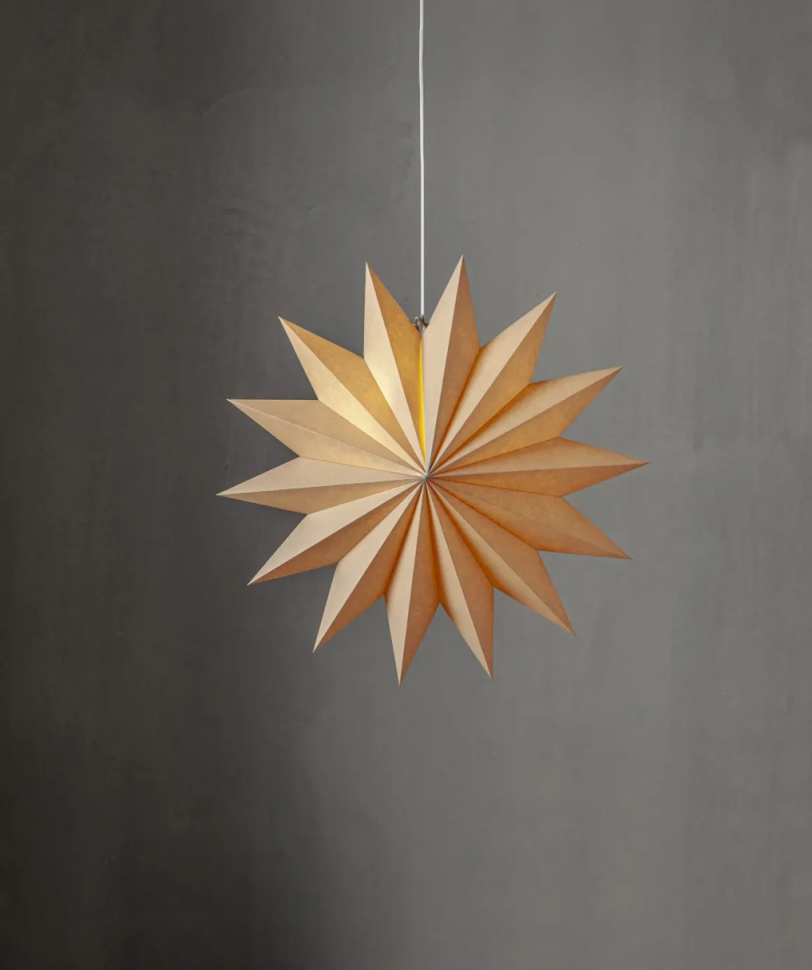 Beige pappersstjärna med hela 14 uddar(!). Ljuvlig stjärna att hänga i fönstret eller luta mot en vägg. Stjärnan sprider mysig stämning och ger hemmet den där speciella advent ochjulkänslan. Sladdställ och ljuskälla köpes separat.