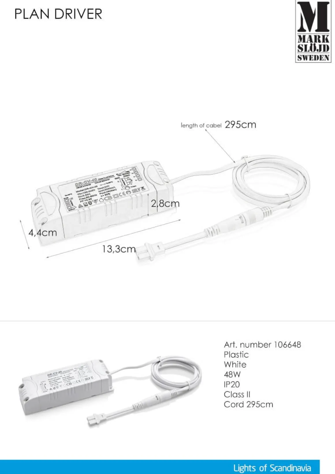 Driver till PLAN panel. 48W och dimbar. 3m 24V sladd ingår.