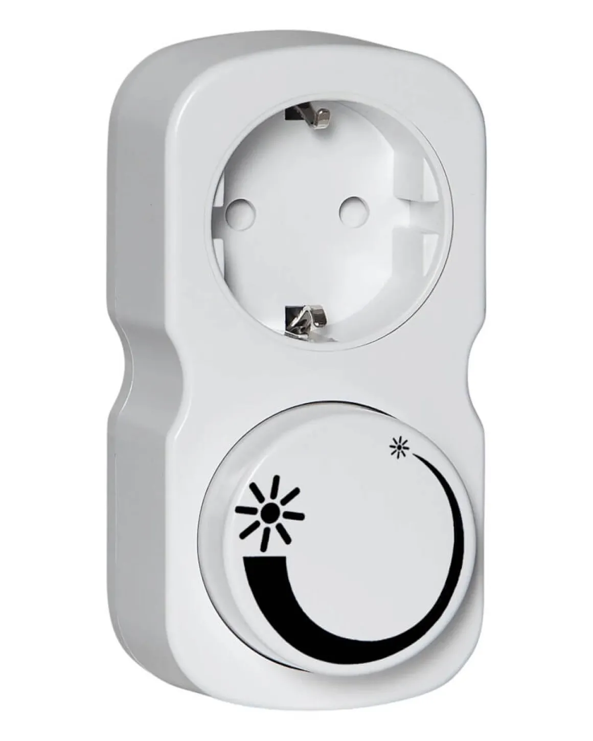 Plug-in dimmer som kopplas in direkt i ett vägguttag. Vrid på knappen för att ändra ljuset. Tryck för att stänga av. 0-200VA. OBS! Får endast användas med dimbara ljuskällor.