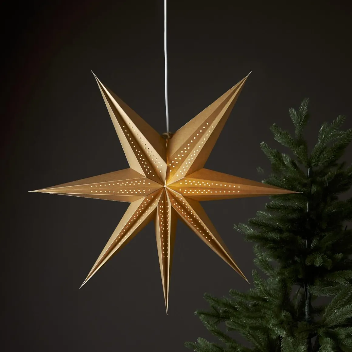 Nätt guldfärgad pappstjärna med ett dekorativt hålmönster och spännande vikning. Modern adventsstjärna att dekorera dina fönster med eller luta/häng mot en vägg.Dekorera till advent och få den där härliga julstämningen.