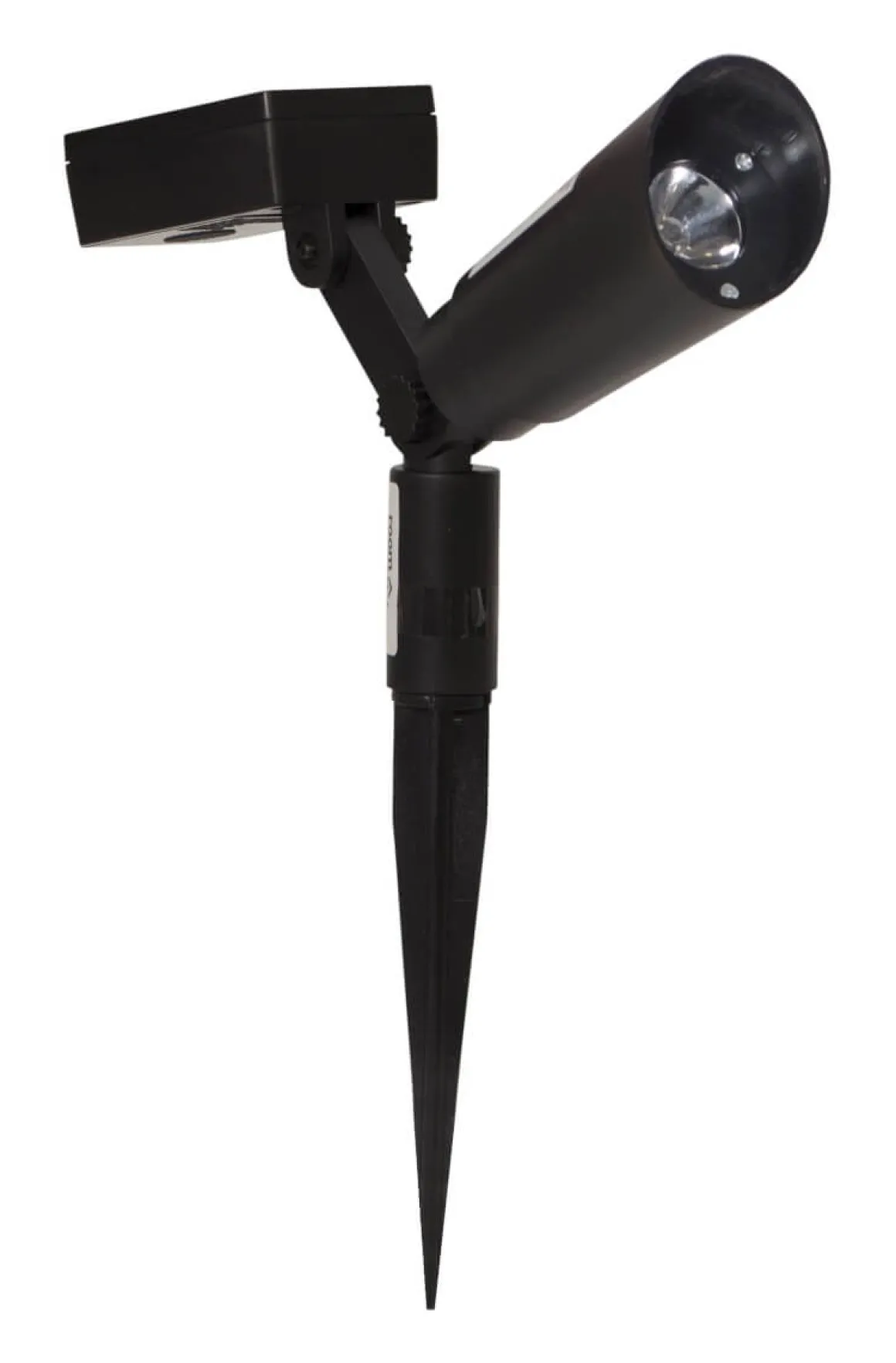 2 pack med svarta solcellsdrivna spotlights, perfekta att lysa upp en mindre buske eller ett vackert konstverk i trädgården.