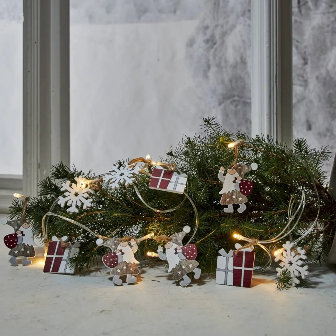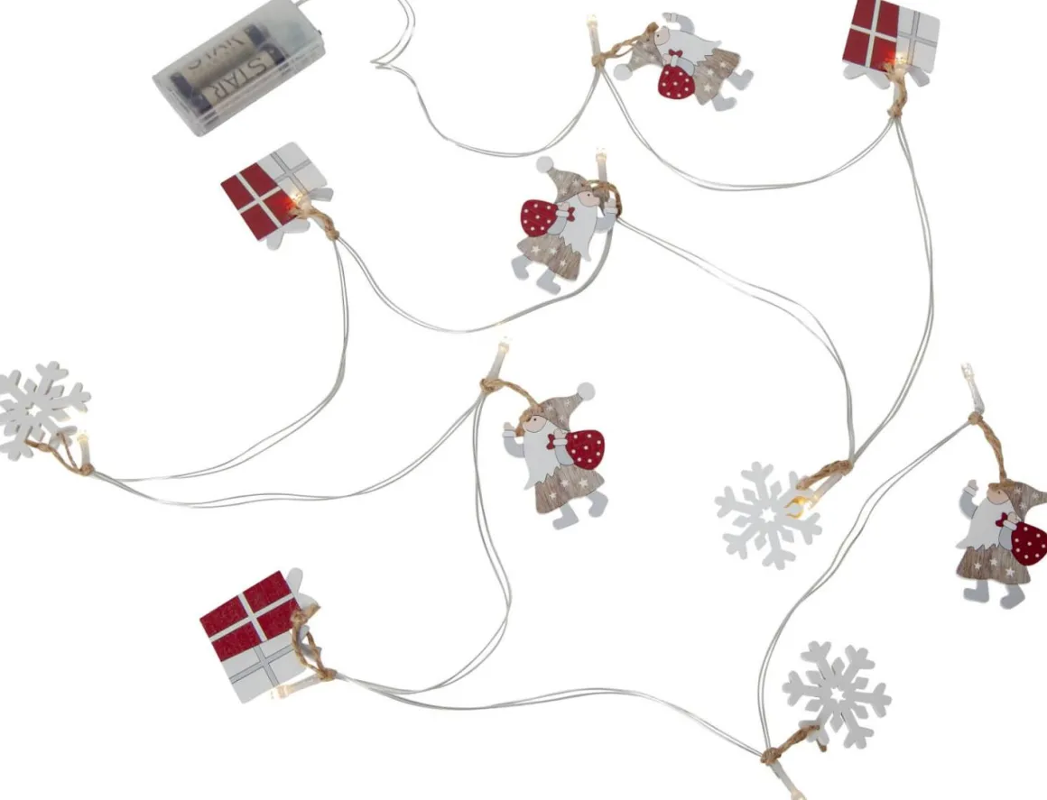 Härlig liten dekorationsslinga med tomtenissar, paket och snöflingor. Perfekt att dekorera med i ett blomsterarrangemang eller kanske på julbuffen. Drivs med 2 AA batterier och timer. Batterier ingår ej.