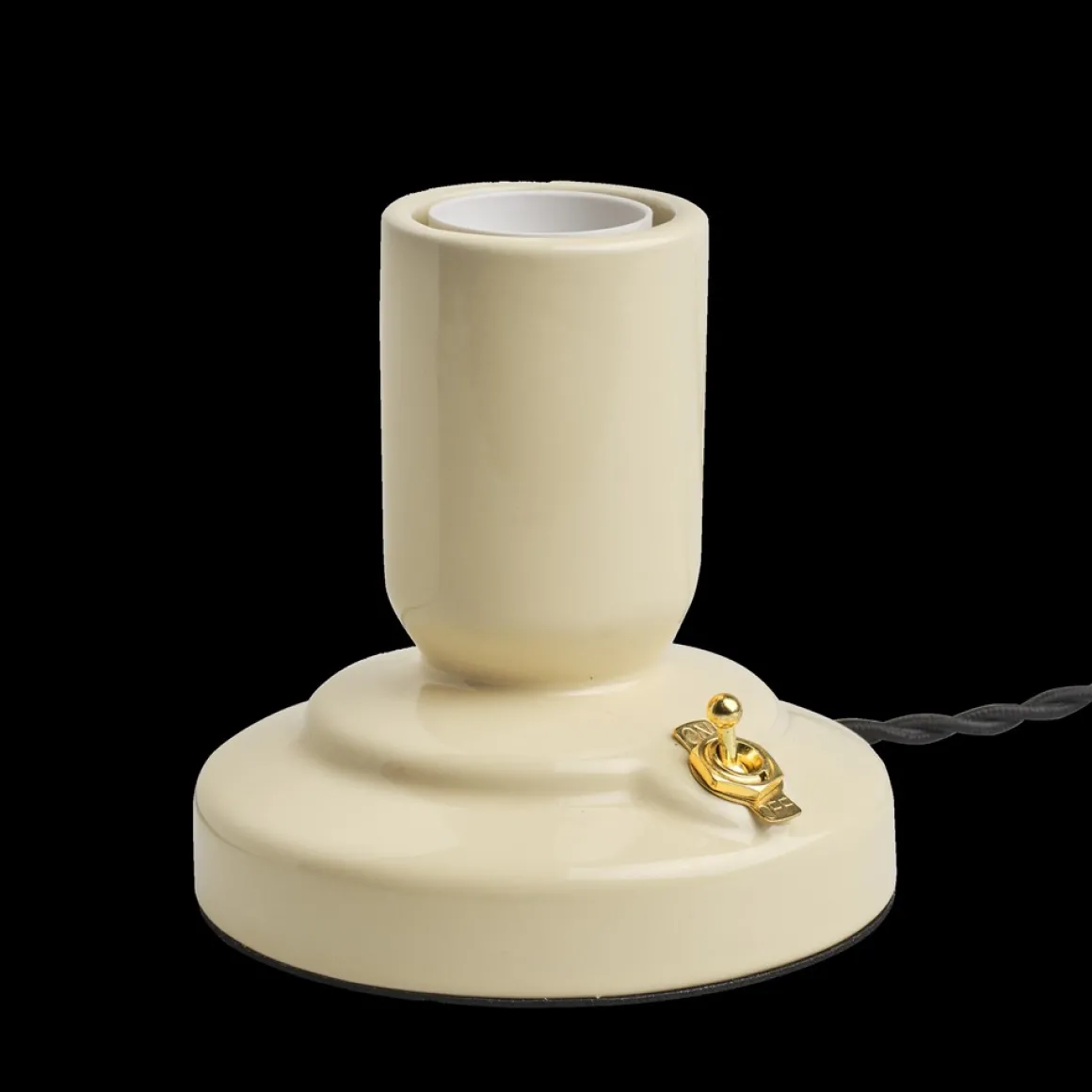Läckert Retro lampfot från unison med kropp i beige porslin med vippströmbrytare i mässing perfekt kombinerad med en tvinnad lampsladd i tyg. Tjusigt!