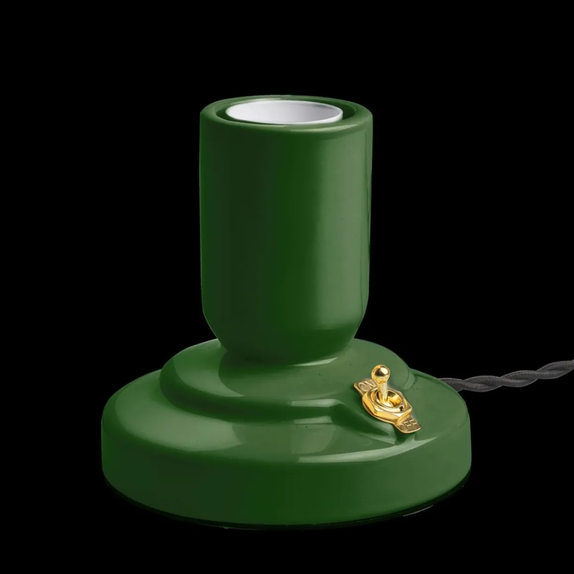 Läckert Retro lampfot från unison med kropp i grönlackad porslin med vippströmbrytare i mässing perfekt kombinerad med en tvinnad lampsladd i tyg. Tjusigt!