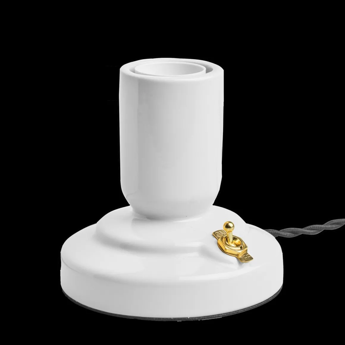 Läckert Retro lampfot från unison med kropp i vit porslin med vippströmbrytare i mässing perfekt kombinerad med en tvinnad lampsladd i tyg. Tjusigt!