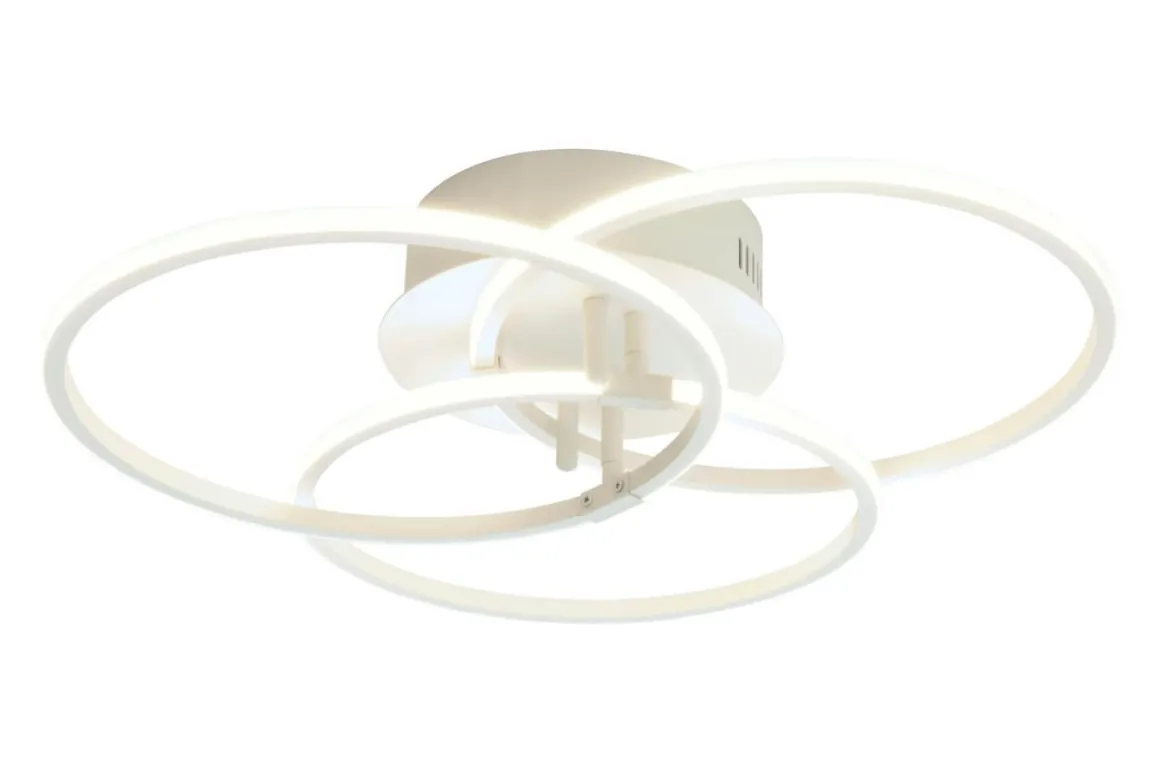 RINGO plafond är en festlig taklampa med tre sammanflätade ringar av vitlackerad metall. Krokupphäng med vit takkopp i metall.