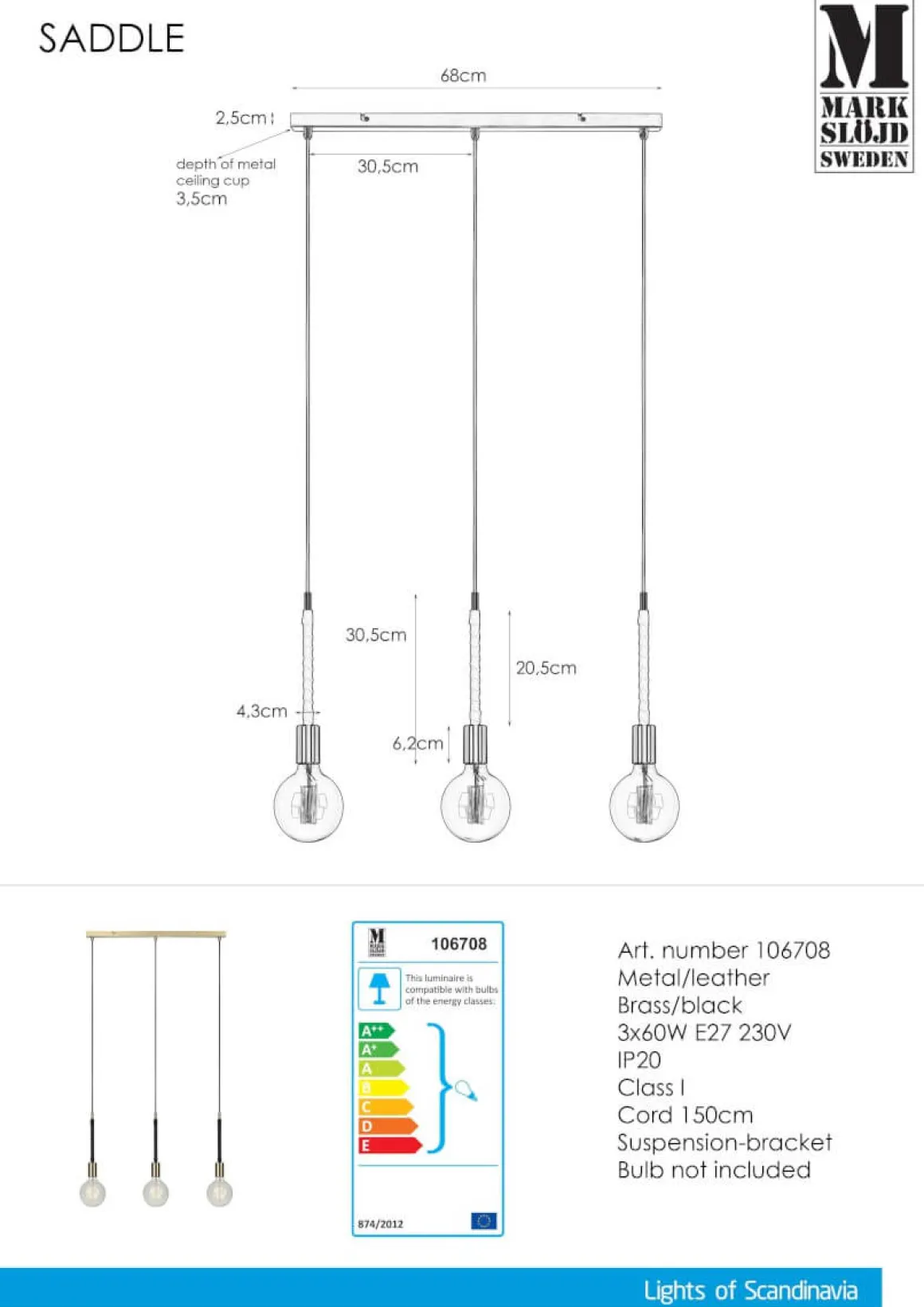 Saddle taklampa från Markslöjd med detaljer i mässing och läder. 1,5m svarta textilsladdar. Fast installation med bygelupphäng