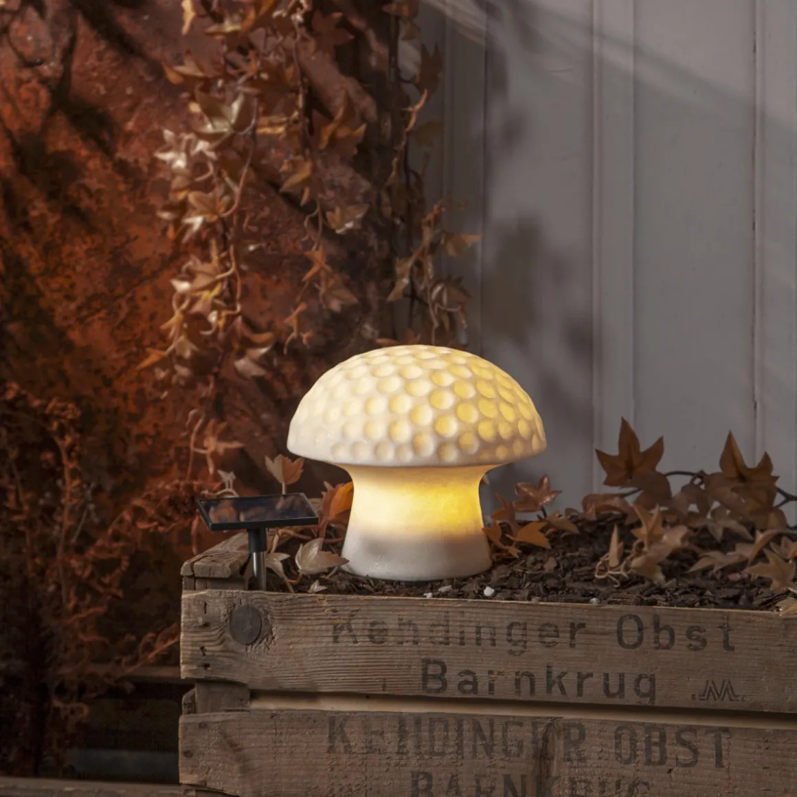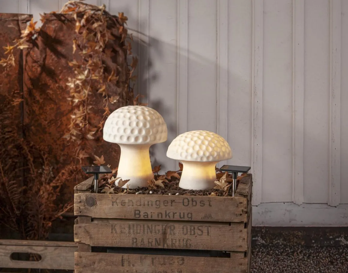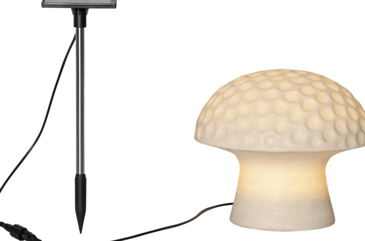 Sandy 15,7 cm solcellsbelysning från Star Trading är en liten svamp gjord av sandstone. Sandstone är en blandning av sand och resin detta gör att vissa färgvariationer och grovlek i sanden kan förekomma. Själva solcellspanelen sitter på enkabel 70 centimeter från sandy vilket möjliggör att ha dekorationen i skuggan och samtidigt ha panelen i solen så att den kan laddas.